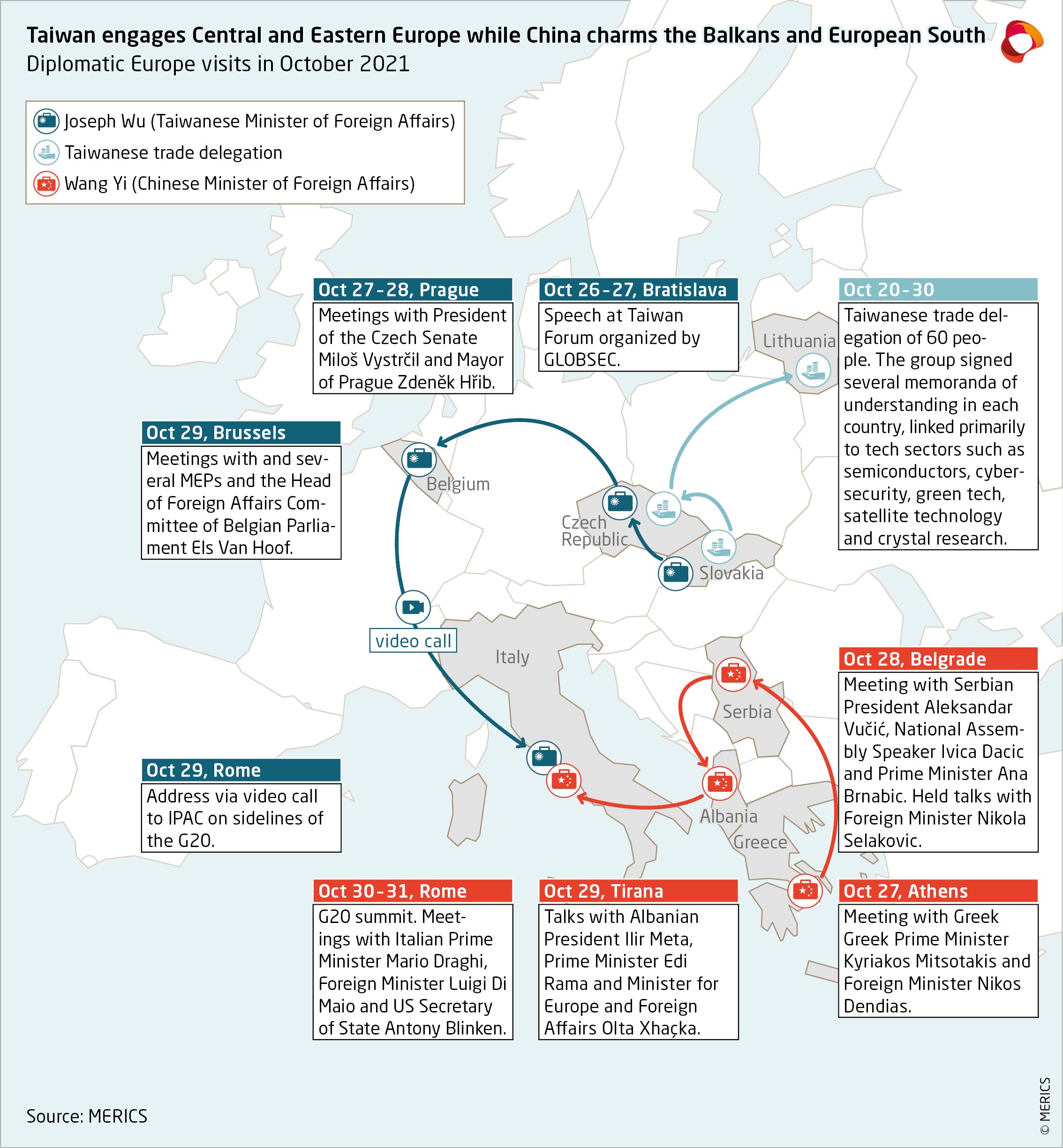 • Wu’s stops: Wu travelled for public engagements and meetings with lawmakers in Slovakia, the Czech Republic and Brussels (see graphic above). He also addressed via videocall an event of the Inter-Parliamentary Alliance on China urging the EU and G20 countries to hold China accountable on human rights and lobby for the EU-Taiwan bilateral investment agreement.