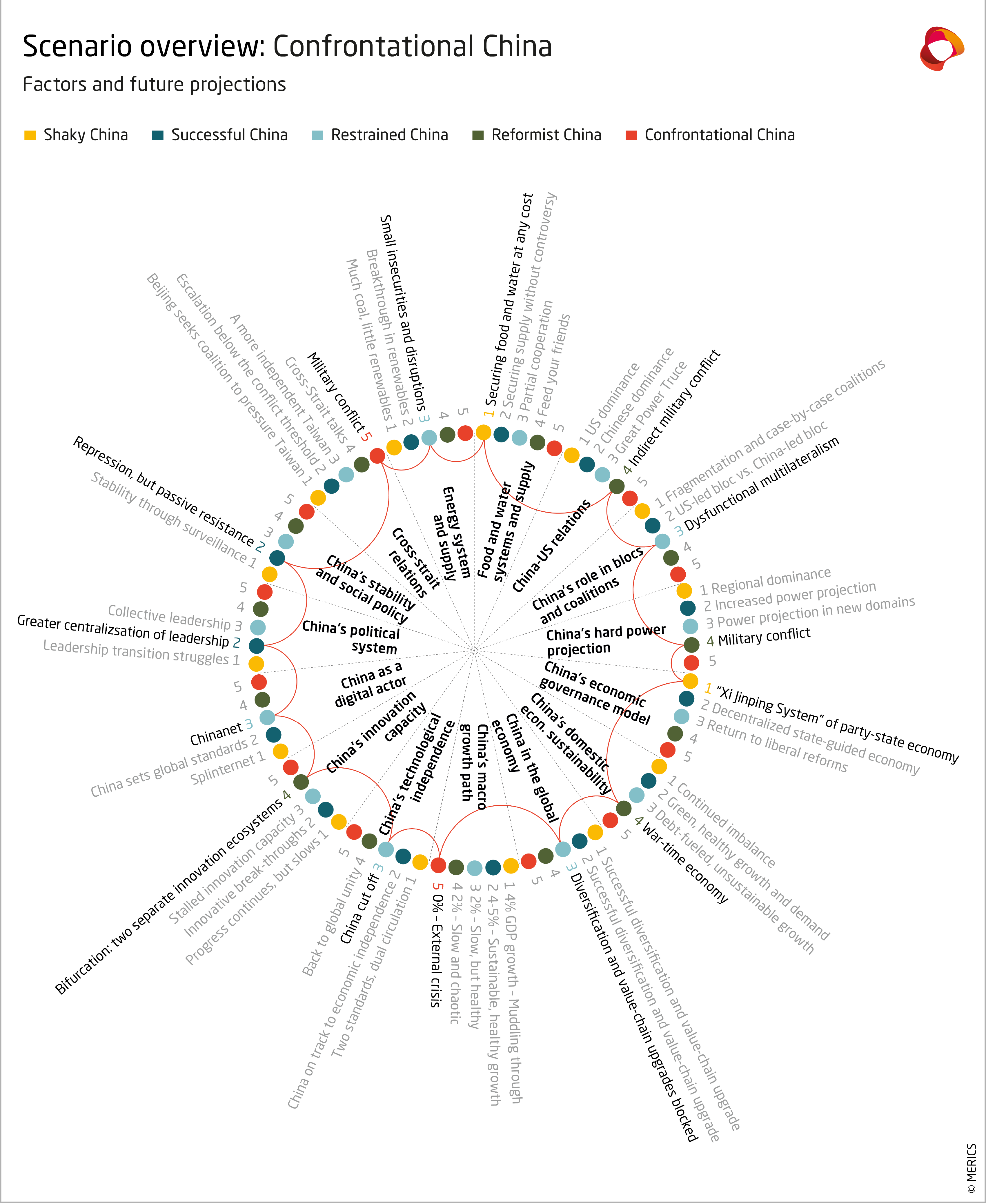In a “Confrontational China” scenario, the rivalry (and, in this case, open conflict) between China and the United States becomes the defining force shaping global affairs both politically and economically.