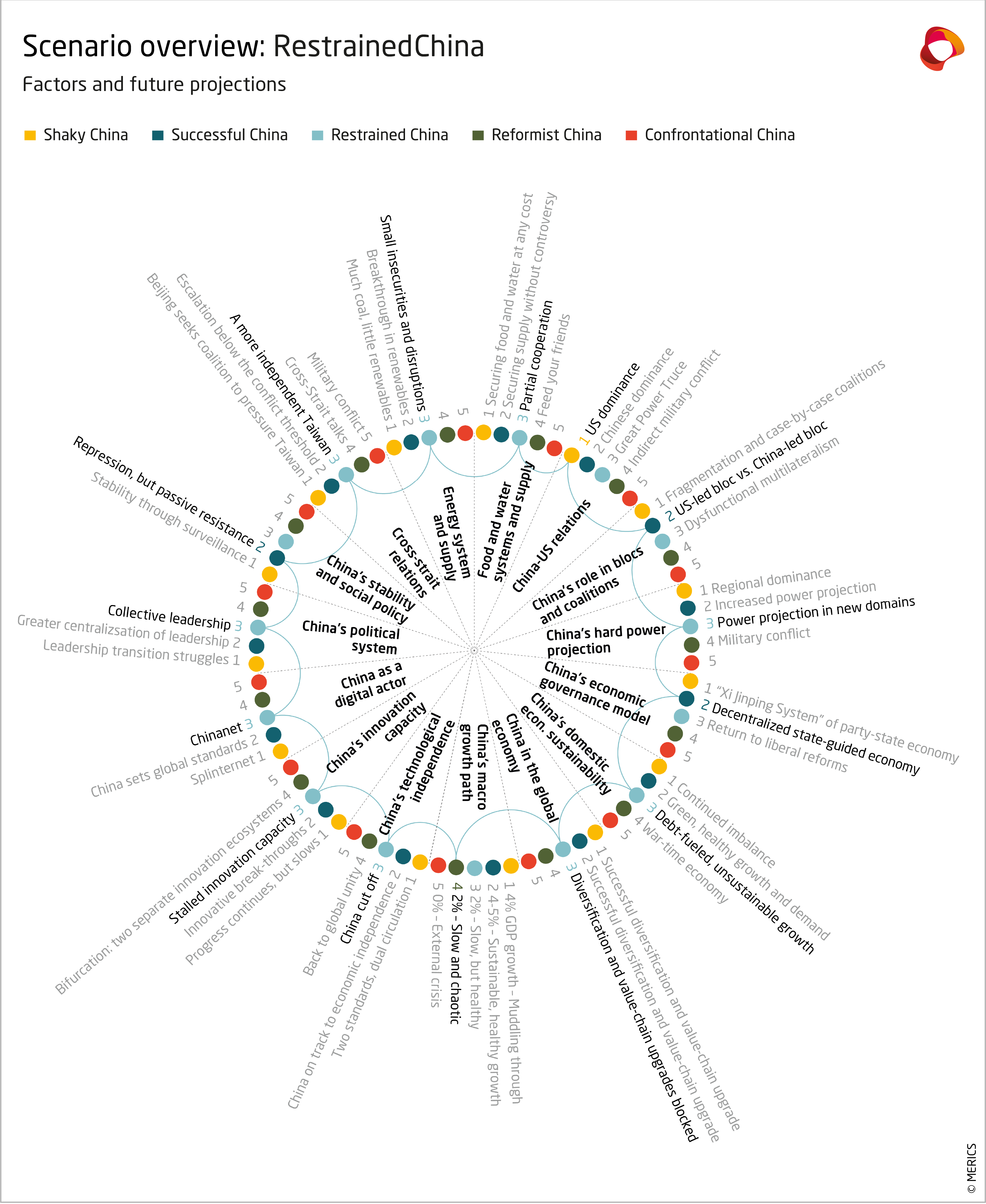 This is the scenario that China’s leadership has long been afraid of – and that many US policy makers are implicitly (or even explicitly) working towards: a “Restrained China” which is under tremendous pressure from the United States and likeminded countries and increasingly unable to successfully pursue its political, economic and technological agenda. On the sidelines of the National Peoples’ Congress in March 2023, Xi Jinping complained that “Western countries led by the United States have contained and suppressed us in an all-round way, which has brought unprecedented severe challenges to our development”. While many in the United States avoid the loaded term “containment”, it is official policy to compete with China in all areas, including its military ambitions and its quest for technological independence. At the same time, China’s own problems, in particular slow growth, an unbalanced economy and lack of innovation power, plus an over-emphasis on ideology and centralized decision making, can seriously hamper China’s development and lead to the country restraining itself.
