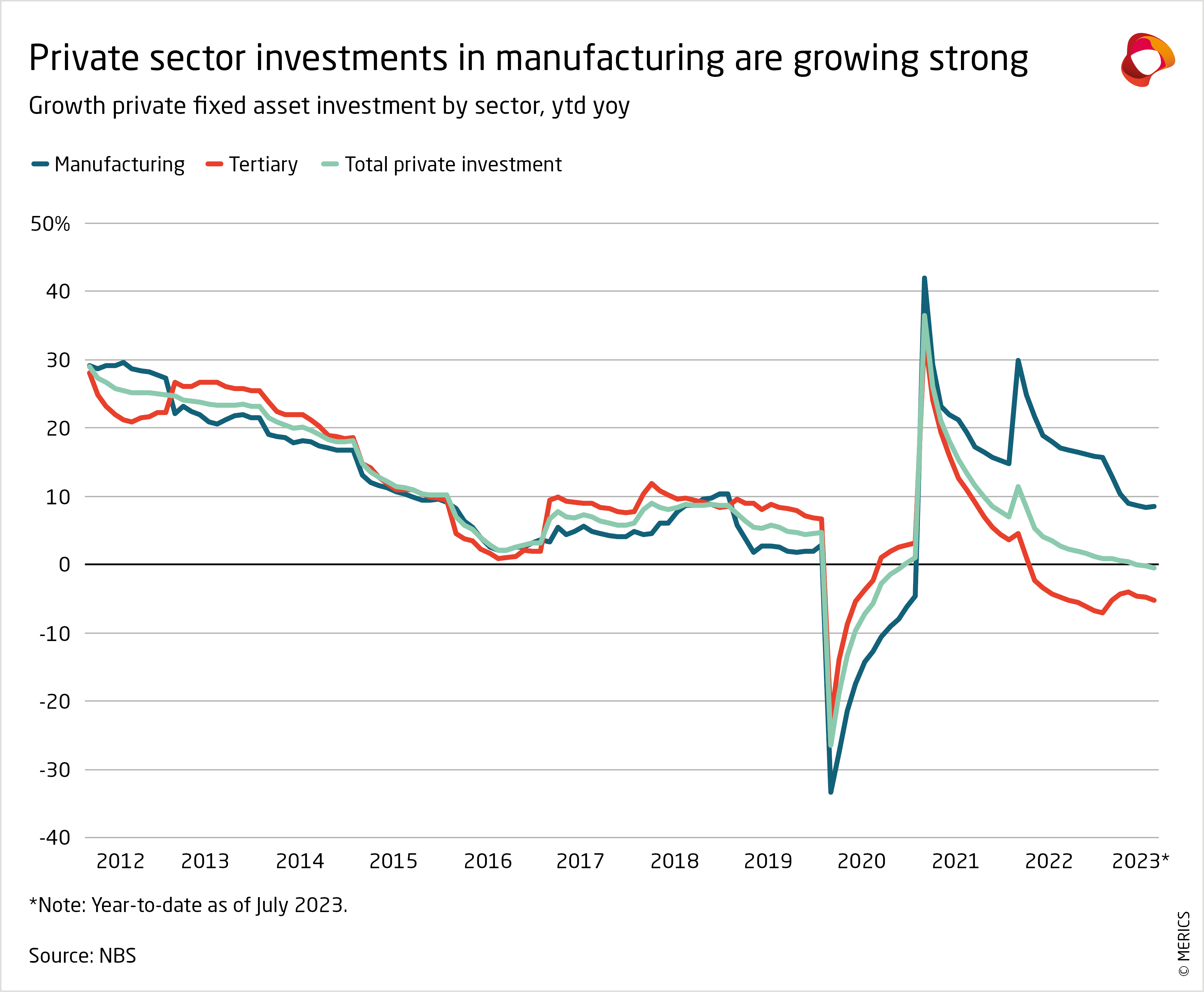 In Xi Jinping’s era the share of POE in China’s fixed asset investment has deteriorated by nearly 10 percentage points. Despite these notable shifts, China is not a command economy in which all companies follow the party overlord by investing in the “real economy.” The deterioration of POE investment is mainly due to a slowdown in services and real estate, while investment in manufacturing has been growing in the double digits.