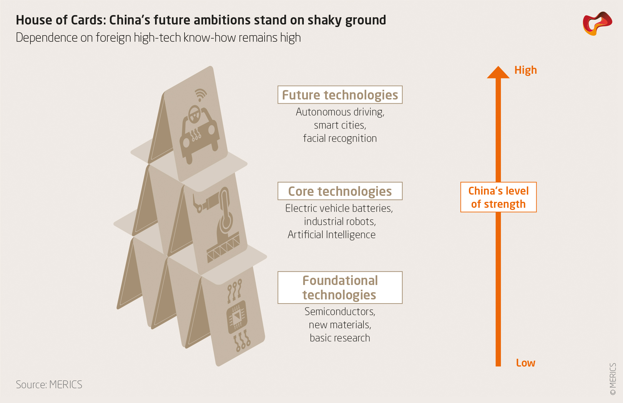 Während chinesische Unternehmen bei traditionellen Hochtechnologien, wie Luftfahrt, Werkzeugbau oder Softwareindustrie, nur mühsam mit ausländischen Wettbewerbern Schritt halten können, zielen sie insbesondere bei intelligenter Fertigung, Digitalisierung und Zukunftstechnologien auf eine weltweite Führungsrolle. In einigen Bereichen sind chinesische Unternehmen bereits in der Top-Liga angekommen: Sieben der zehn wichtigsten Batteriehersteller für E-Fahrzeuge stammen aus China. Telekom- Unternehmen wie ZTE und Huawei sind bereits führend im 5G-Netzwerkausbau. Gerade diese beiden Unternehmen verdeutlichen jedoch auch, wie abhängig China noch immer von ausländischen Kerntechnologien ist. US-Sanktionen bedrohen ihre Existenz, weil u.a. der Zugang zu Mikroprozessoren versperrt ist.