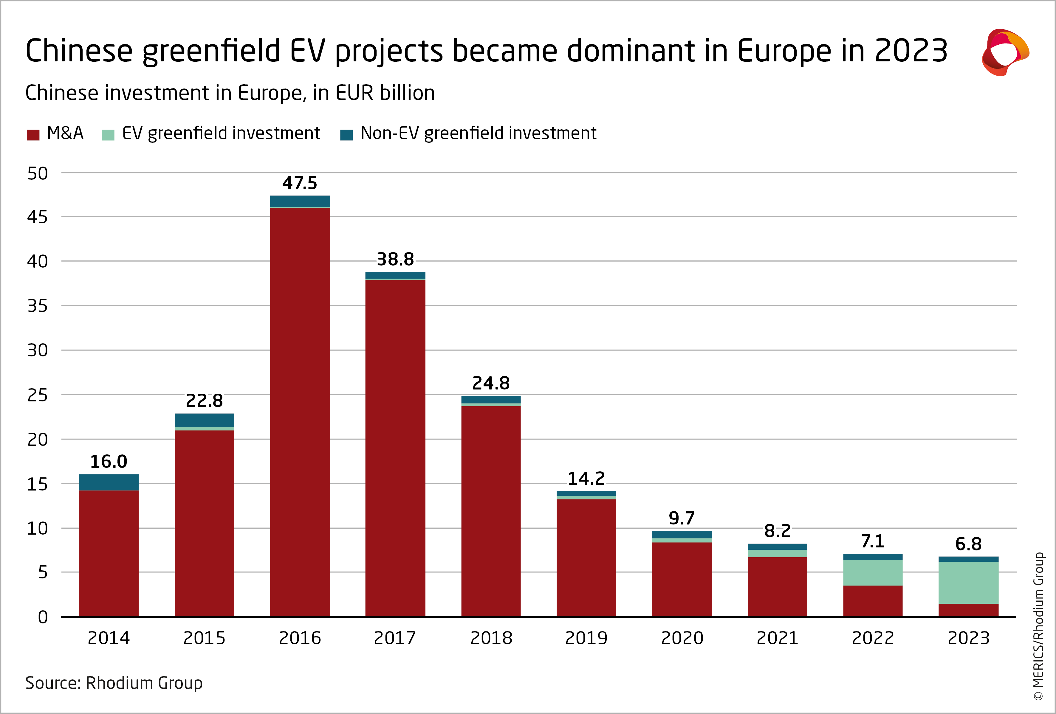 Fusionen und Unternehmensübernahmen (M&A) gingen 2023 im Vergleich zum Vorjahr erneut zurück, um 58 Prozent auf 1,5 Milliarden Euro. Es war die steigende Zahl von Greenfield-Investitionen in der E-Mobilitätsbranche, die trug dazu beitrug, dass die Direktinvestitionen chinesischer Akteure in Europa nicht noch stärker einbrachen. Diese Investitionen, bei denen Unternehmen im Ausland Tochterfirmen gründen oder neue Produktionsstätten errichten, hatten 2023 einen Anteil von 78 Prozent und sind inzwischen die vorherrschende Form chinesischer Investitionen in Europa.