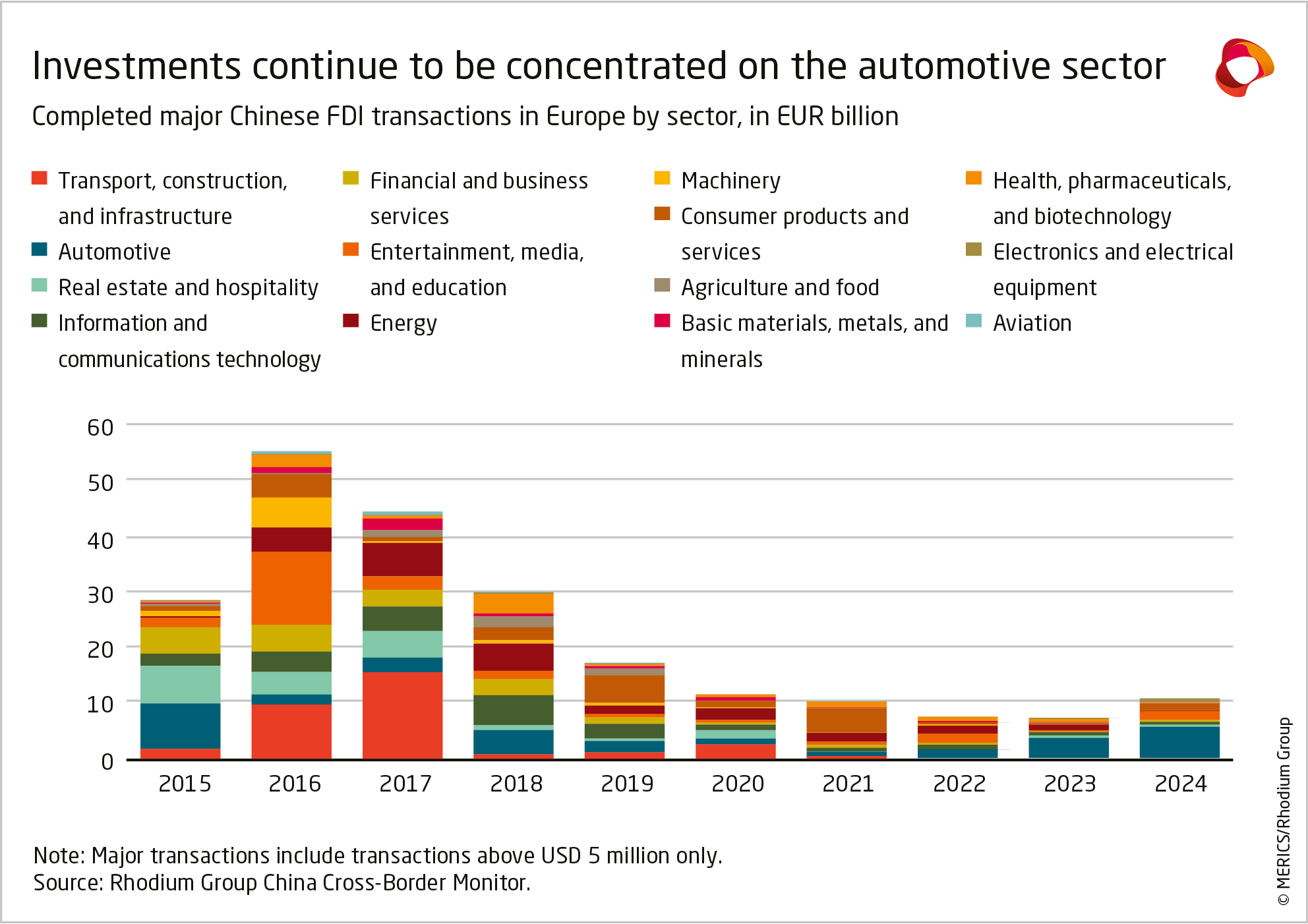Chinese companies invested EUR 10 billion in the EU and the UK in 2024, 47 percent more than the year before. This represents only one fifth of the 2016 peak but is nonetheless the first significant rebound in Chinese investment in Europe since 2016.