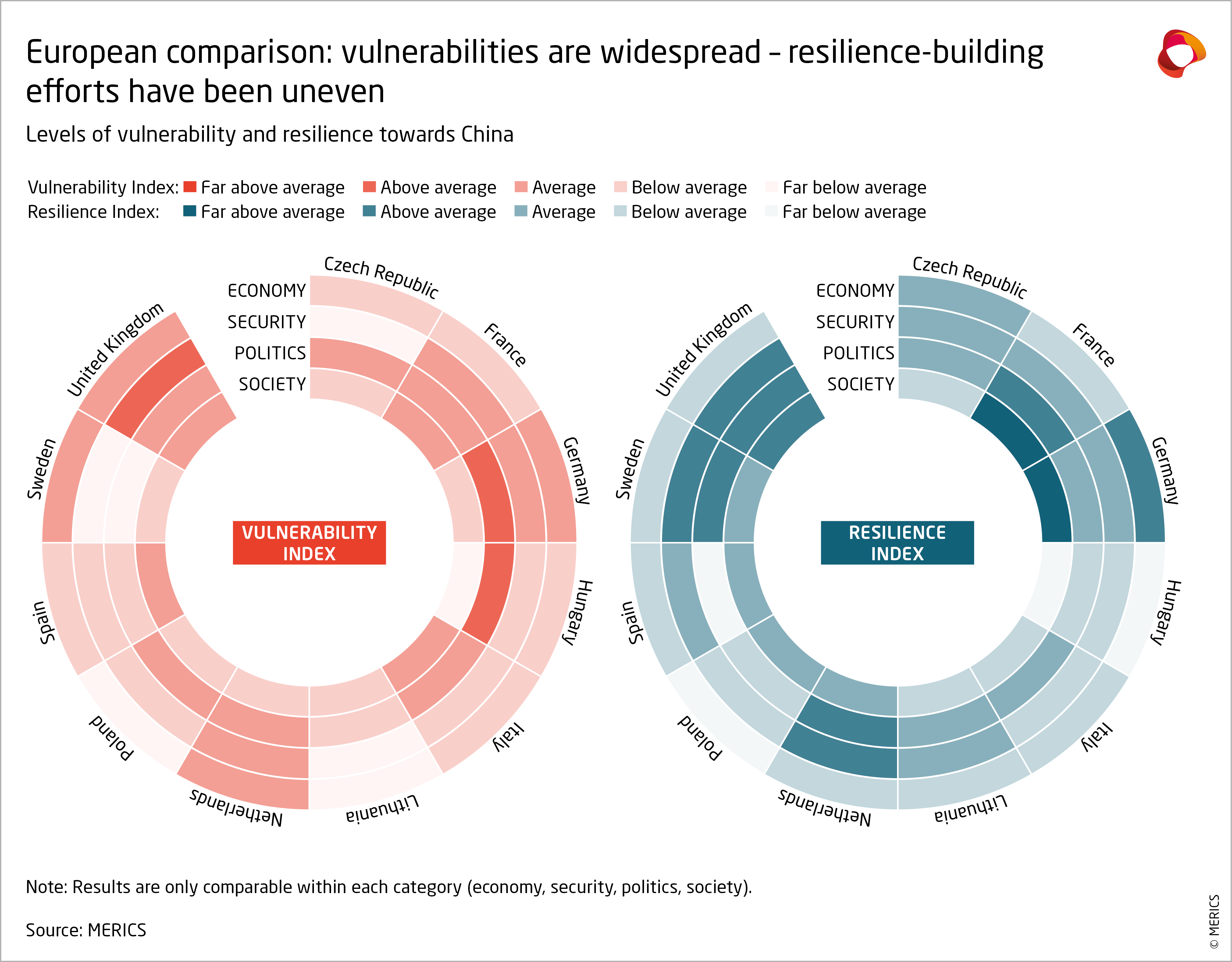 The exercise is comparative, China-specific in nature and focuses on risks linked to deliberate actions taken by China. It does not seek to assess the overall vulnerability and resilience of the covered countries in absolute terms. The benchmark score for each indicator was set by the highest vulnerability or resilience among the covered countries and is as such not applicable beyond Europe and this group of countries.