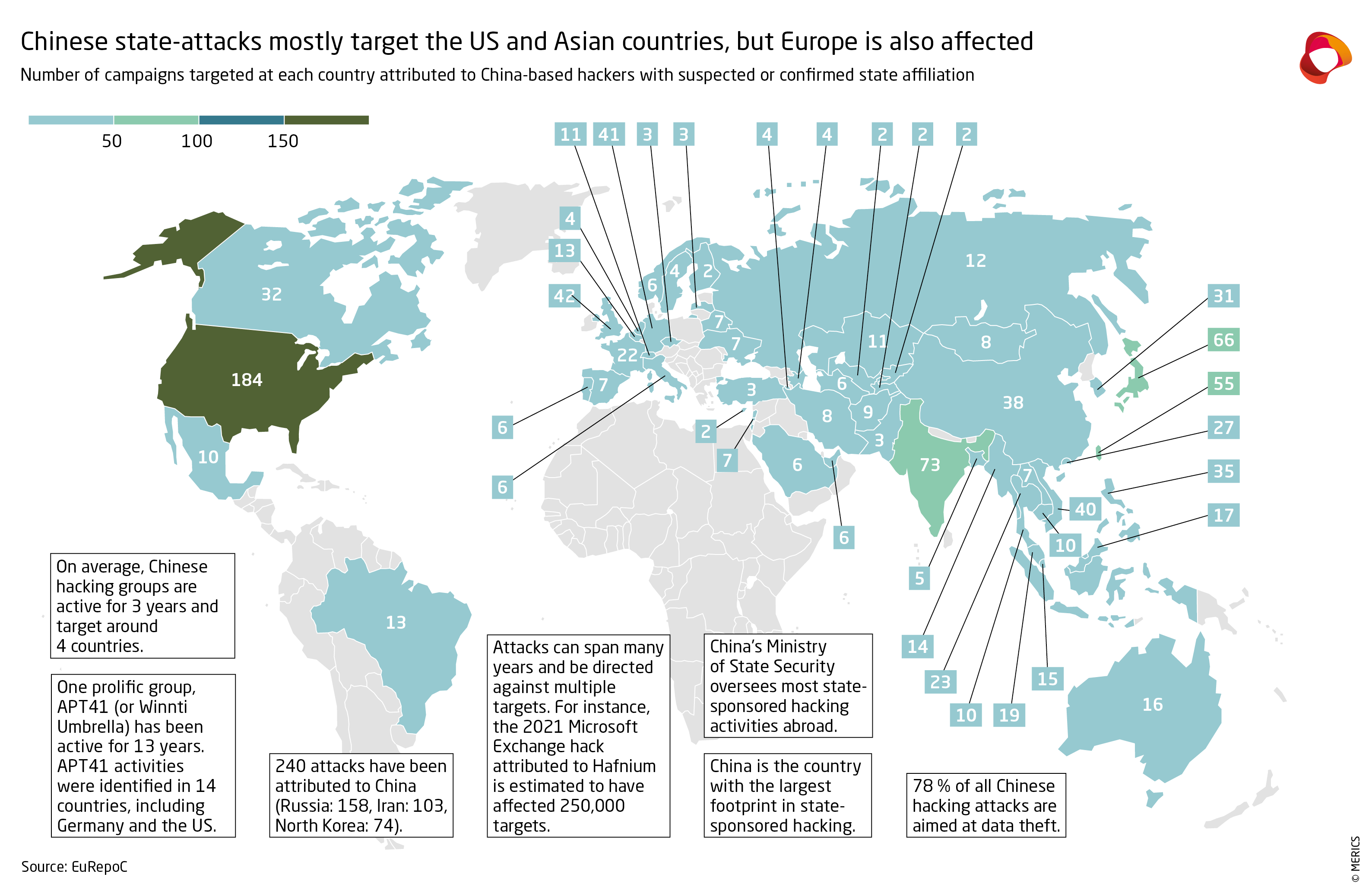 The fact that many attacks originate in China is not necessarily evidence of government action. Given that China has 25 percent of the global online population and hosts many online servers with no or minimal protection, it is not surprising that many attacks originate in the country or can be traced back there.50 However, based on EURepoC data, the research by international cybersecurity firms, and advisories from intelligence agencies, it is clear that China’s government is carrying out a deliberate campaign to obtain intelligence using hacks.