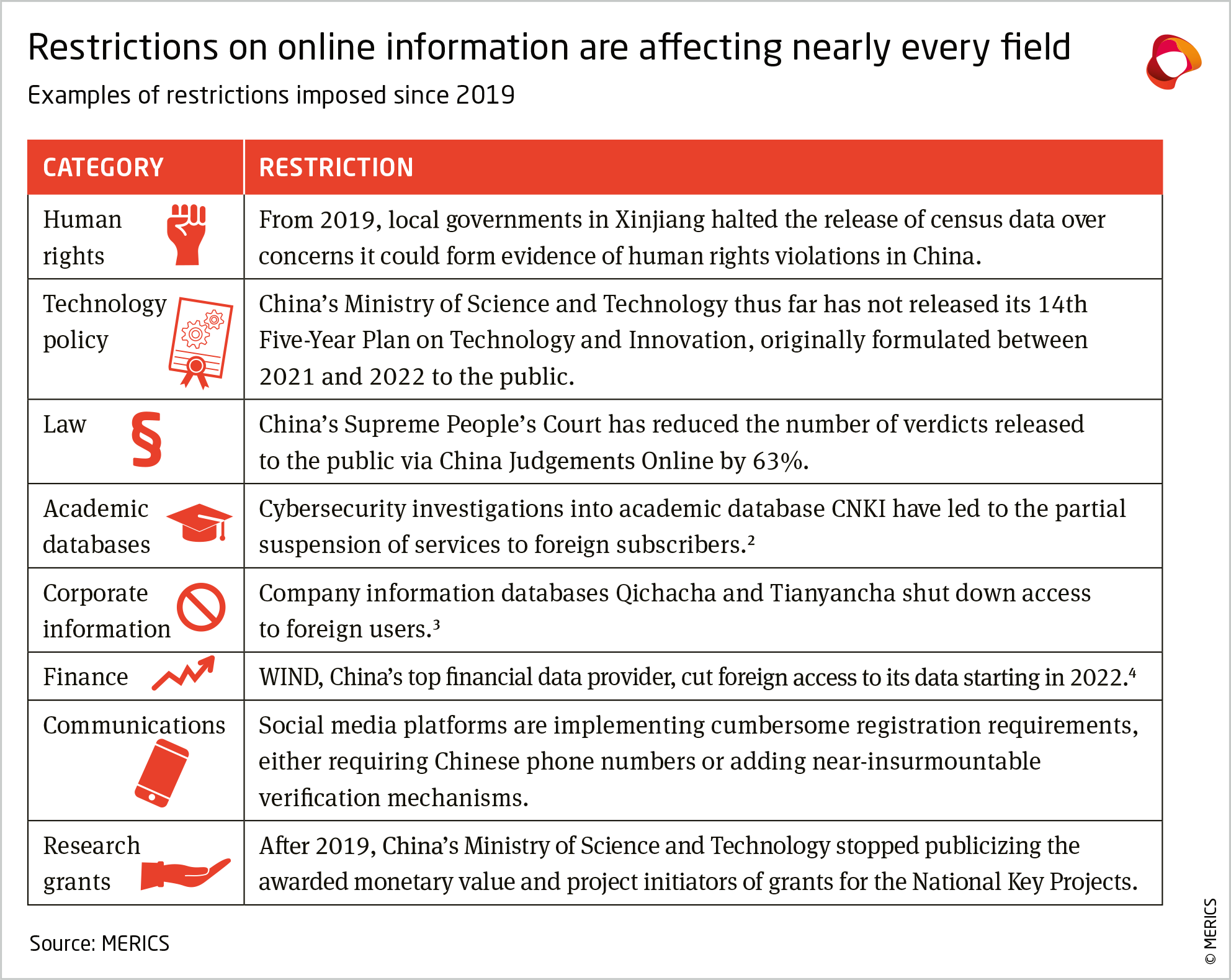 - Technology policy seems to have the most rapidly increasing restrictions. While topics like human rights had always been sensitive in China, competition over science and technology is driving Beijing to reassess disclosure of key sources in this field.