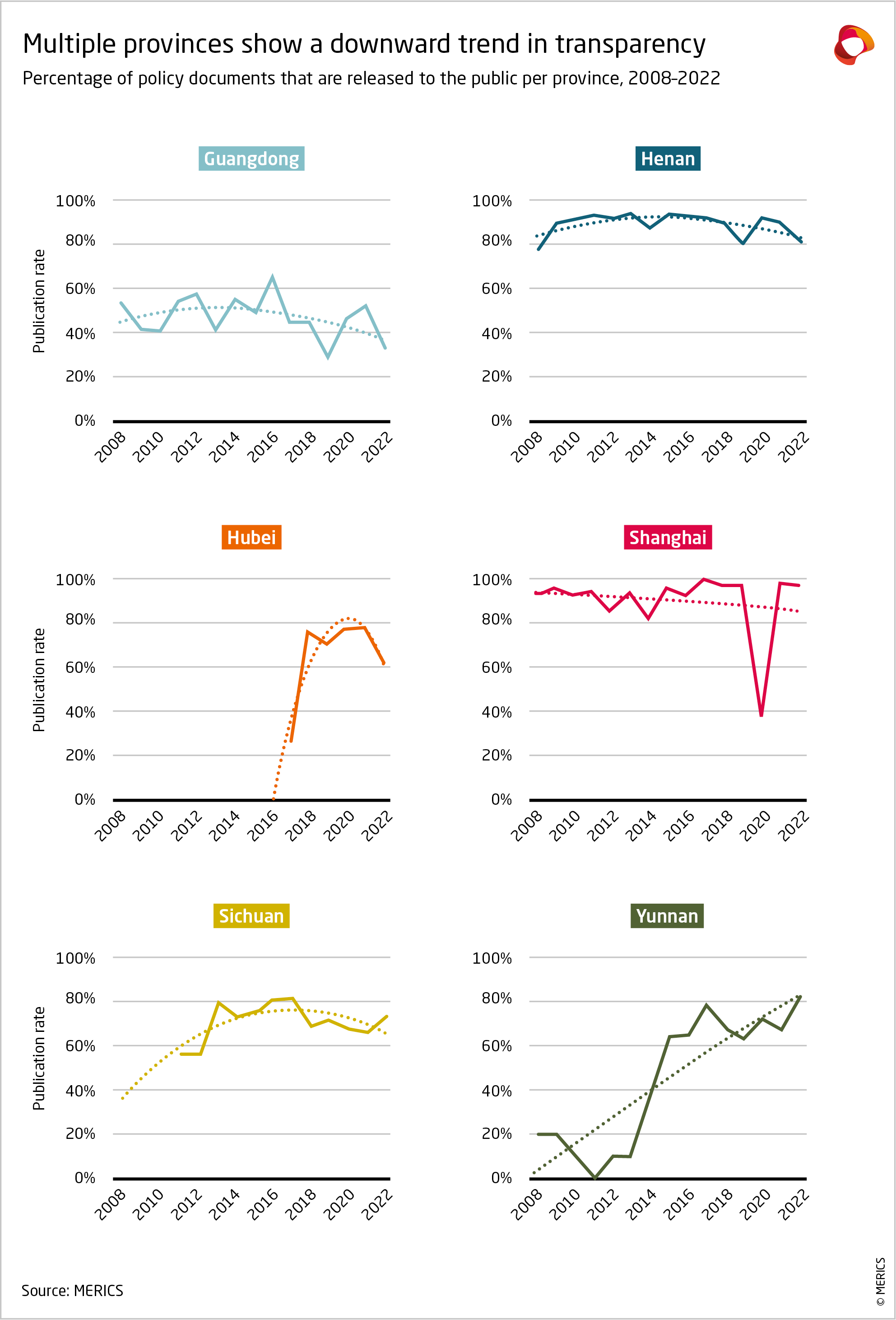 Such patterns are not exclusive to the State Council either. Although differences between individual provinces are significant,16 policy transparency rates in four out of six surveyed provinces17 show a downward trend (exhibit 3). As with the figures from China’s top government organ, these peak in the years between 2013-2018 and decline especially after 2019. This is slightly later than for the State Council and could be due to delayed policy diffusion towards lower levels. The fifth (Shanghai) shows no clear pattern due to outliers in the data, and the sixth (Yunnan) is a more remote province—suggesting it might be an outlier because the OGI reforms were implemented relatively late.