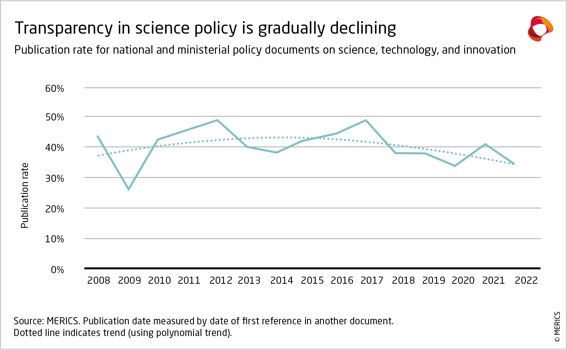 Closely following these trends, actual policy transparency improved until 2015, especially during Xi Jinping’s first presidential years. After its peak in 2015, however, publication of top-level documents by China’s State Council15 decreased from 88 to 68 percent in 2022 (exhibit 2). Variation between individual years occurs as political cycles affect policy-making processes, such as with Xi’s ascension in 2013, but the steady downward trend suggests that the decrease in transparency is systematic.