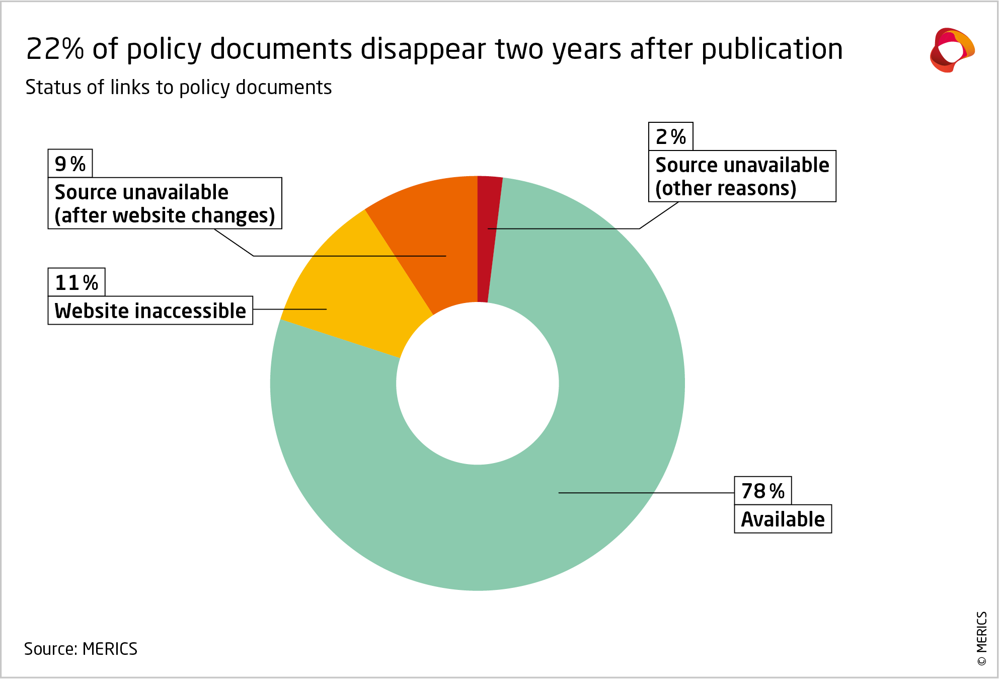 Exhibit 6 shows that only 78 percent of links to policy documents were still available within two years of publication. The majority of these relate to inaccessible websites20 or website updates. It is possible some of these remain available elsewhere, but this is not the case in all instances. A smaller but still significant portion (2%) is due to websites actively removing documents from their portals.21 For this group, the portal still worked as before but the specific document was gone.