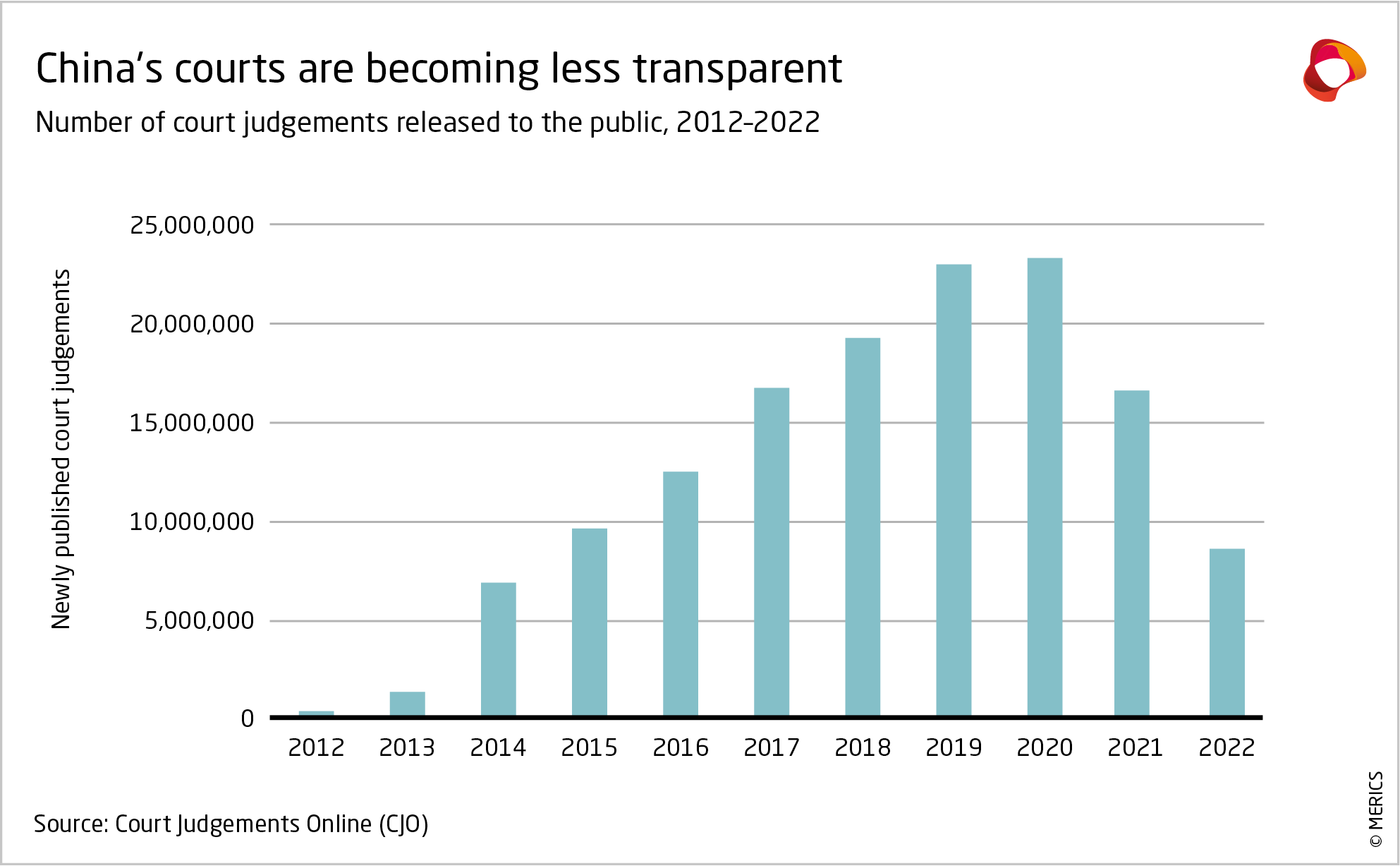Starting from 2021, the Supreme People's Court has been reducing the number of cases it releases on Court Judgements Online (CJO), the official database for judicial rulings. While the Supreme People’s Procuratorate prosecuted 12 percent more cases from 2017 to 2022,22 the publication of court cases decreased by 63 percent between 2020 and 2022 (exhibit 7). A central reason is that such court reforms do not just serve transparency but equally facilitate standardization of judicial behavior and top-down supervision.23 This means courts can restrict disclosure where it does not align with political objectives.