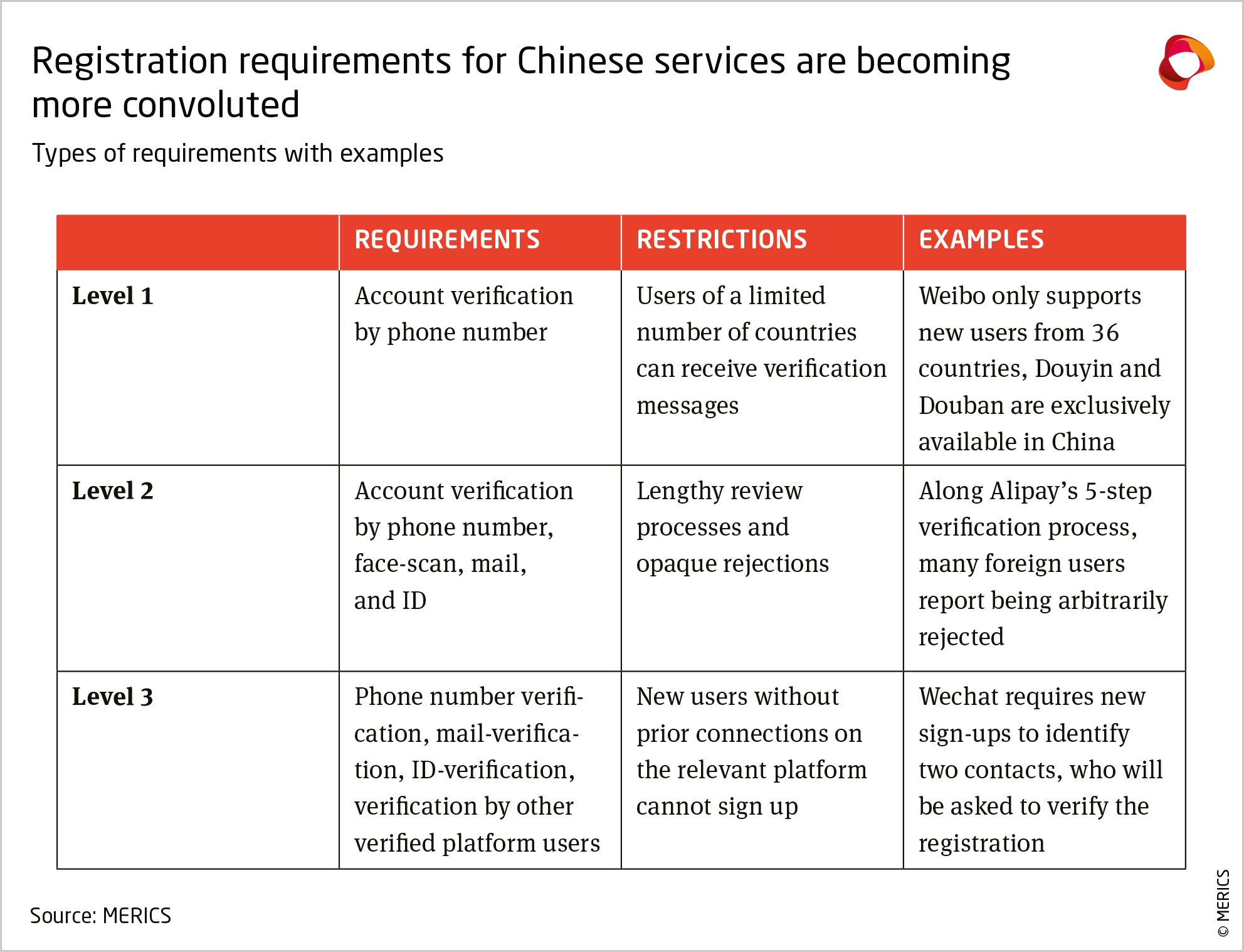 Below, two case studies will shed light on one regulatory restriction and one technical access restriction, respectively, that China’s internet actors have noticeably made more use of. The first case study reveals not only that many apps aren’t available outside of China, but that on some platforms, registration requirements have led to effective access barriers for foreign users (section 3.3). The second case study focuses on a form of technical access restrictions: geo-blocking.