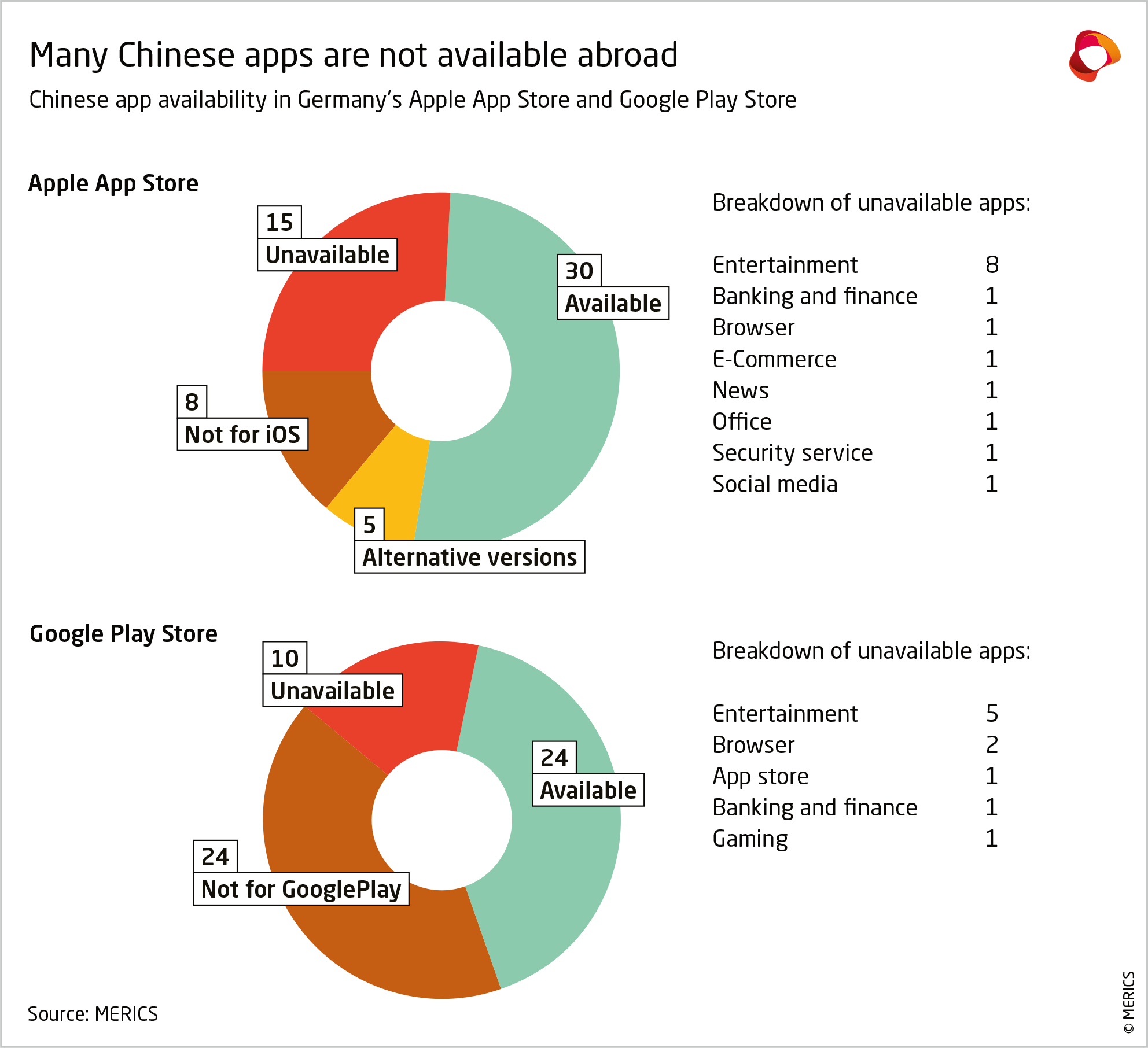 Because of China’s Google ban, many apps are not developed for the Google Play Store. In many cases alternative download files for Android exist, but involve Chinese app marketplaces or require users to bypass the security systems of app stores altogether. Thus, these figures are less indicative than for Apple’s App Store.