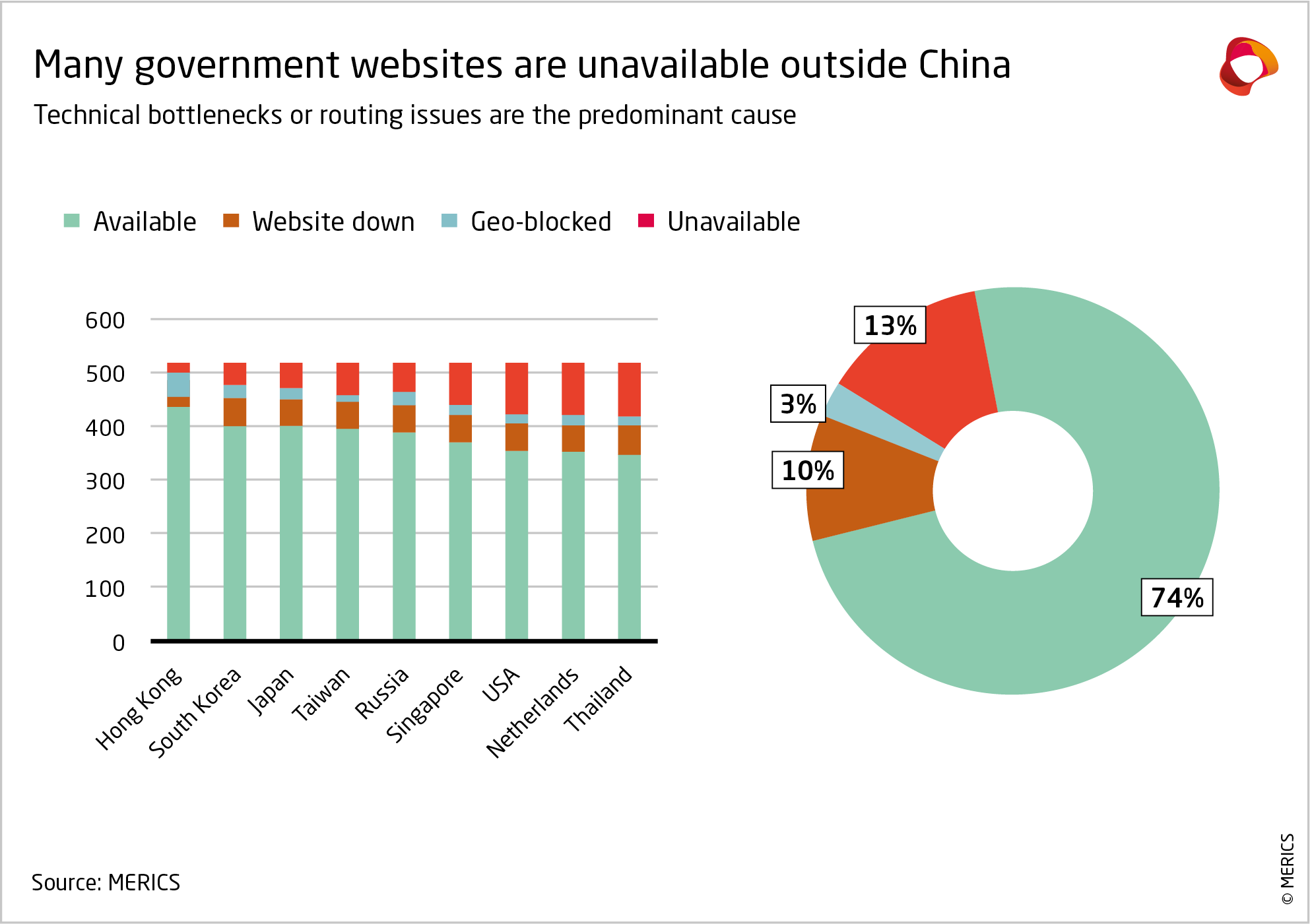 A significant number of Chinese websites are unavailable from abroad, with reasons ranging from technical issues to outright geo-blocking of foreign users. On average, only 74 percent of links to 517 government websites were available from our test locations (exhibit 9), compared to 90.7 percent of commercial websites. Unavailability was worse especially in regions either more remote from China (USA, the Netherlands) or with worse internet infrastructure (Thailand).