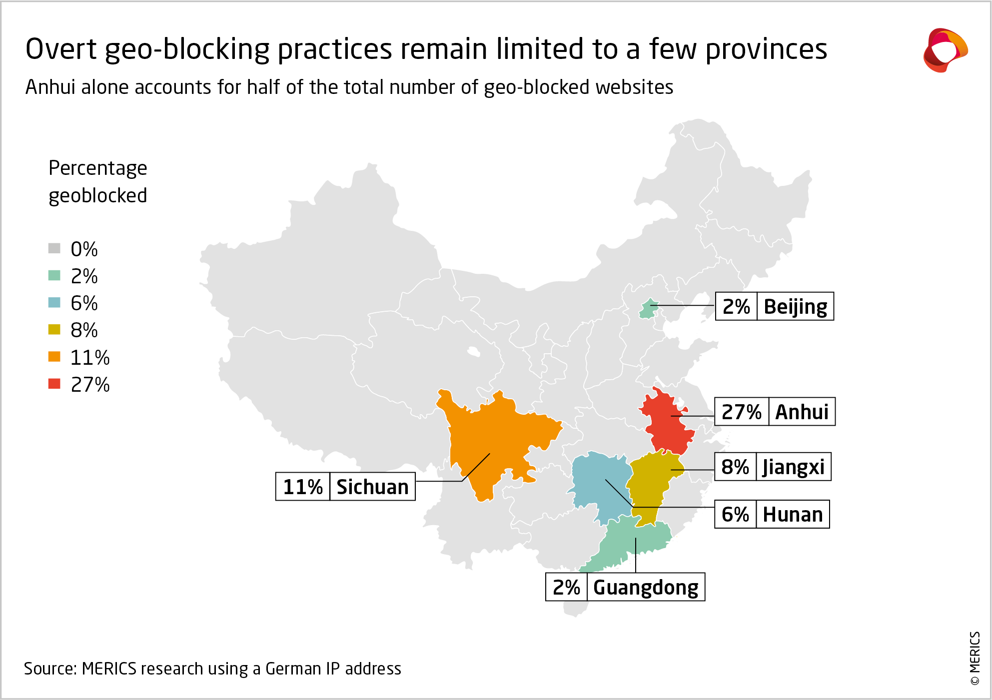 - Geo-blocking (3% for government websites, 2.2% for commercial websites). Websites can restrict users from specific geographic areas from viewing their content. Commercial websites typically geo-block for intellectual property reasons, whereas government websites do so for political reasons. Anhui province was responsible for the most geo-blocked government websites (exhibit 10), yet most provinces did not conduct any geo-blocking.