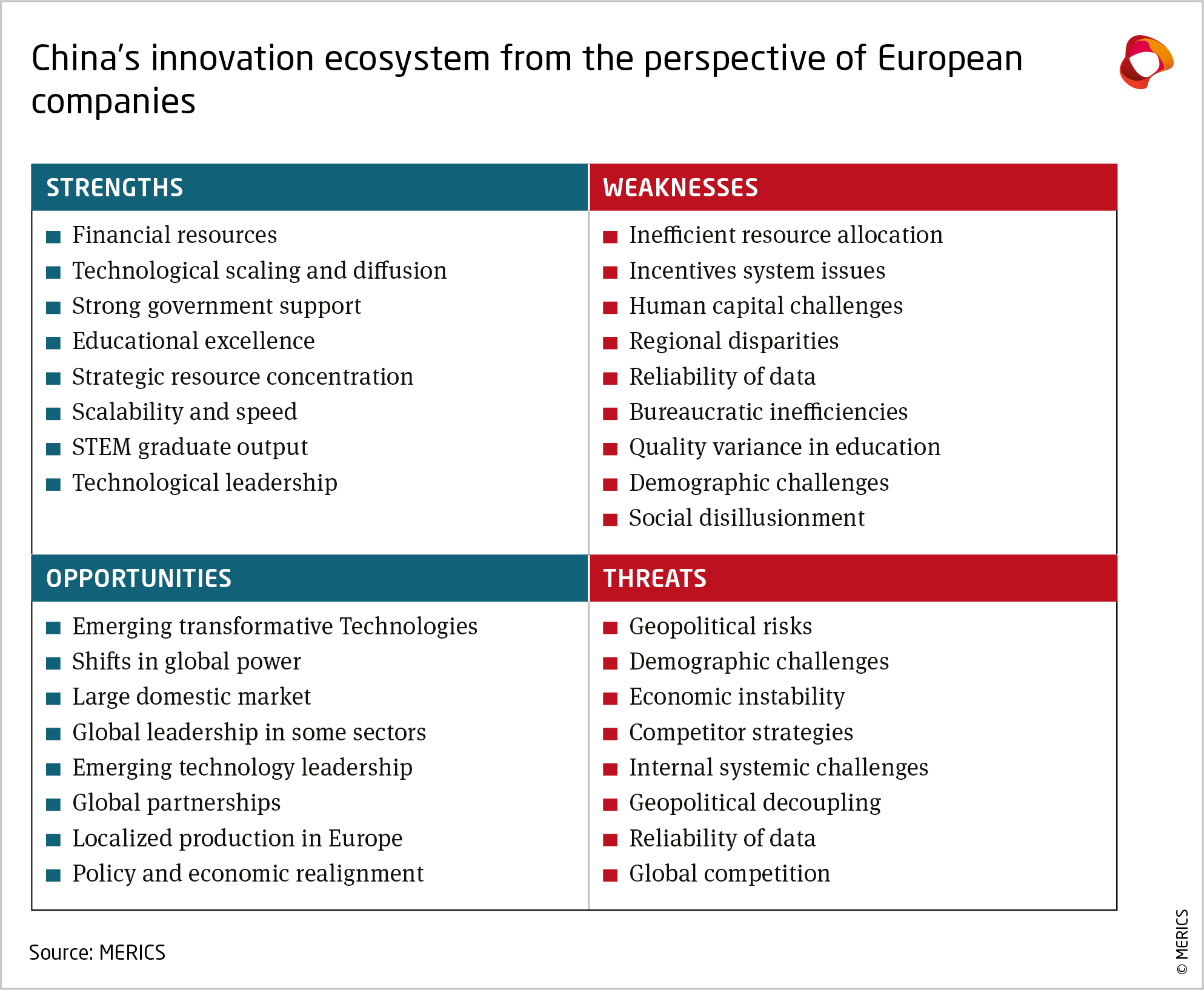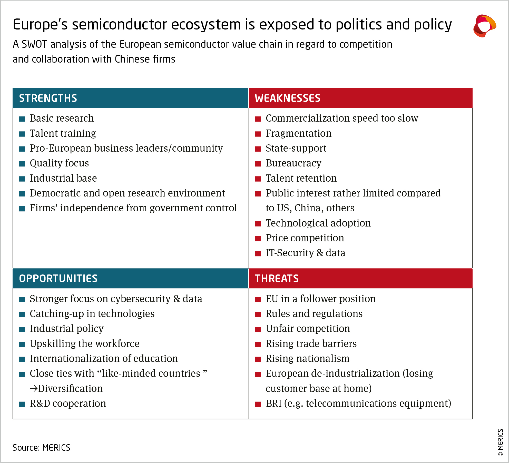 - Many European companies rely on China’s innovation ecosystem in their global R&D strategies, which over time can jeopardize their technology, often followed by their market share in China, and eventually globally.