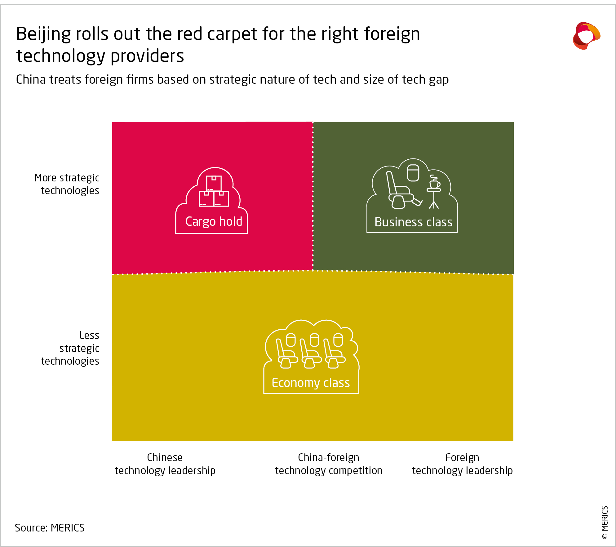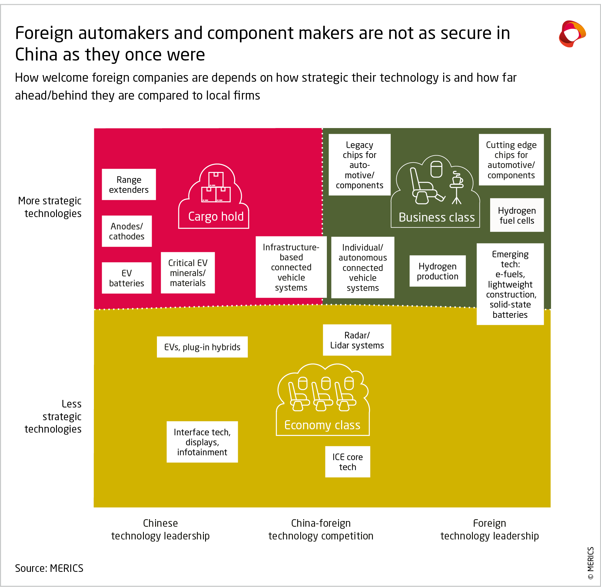 Firms in ‘economy class’ tend to have less uncertain fates. Beijing is largely ambivalent about foreign investment in their sectors – typically downstream in value chains and consumer-oriented goods – as the investment bolsters employment, tax revenue, HR development, etc. without taking market share from local firms that could be used to fund R&D in a strategic technology.