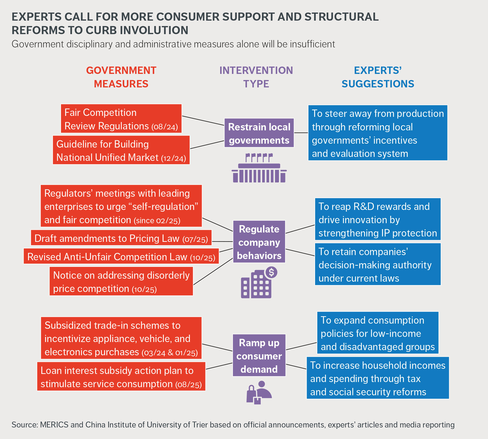 China’s 2025 Government Work Report8 spoke of “tackling ‘involution-style’ competition.” The Chinese state seems to be adopting a multi-pronged approach (see Exhibit 1). Since the launch of the “anti-involution campaign,” experts seem to have more space for debate and are broadly discussing root causes and how to tackle the problem. Many emphasize the need to boost domestic demand, calls that are hardly new. As the argument is well established, this analysis focuses on newer proposals.