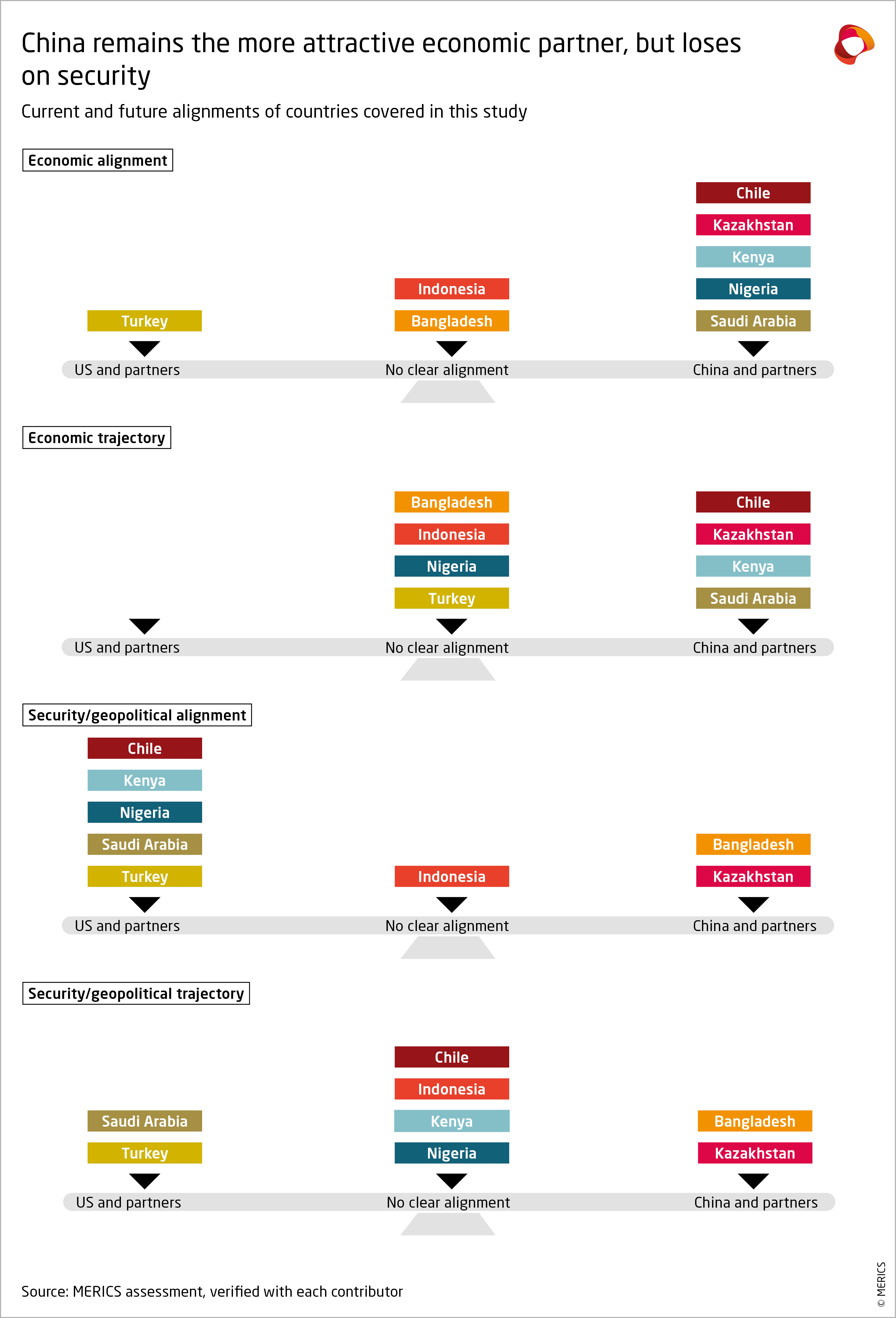 It is of major importance to European leaders to understand how actors outside the usual grouping of rich, liberal market economies view this changing ecosystem, and how they think about Europe in a complex world of actors who all have agency. To that end, we commissioned eight contributors to describe their countries’ views of China and US-China rivalry. Their analyses cover Bangladesh, Chile, Indonesia, Kazakhstan, Kenya, Nigeria, Saudi Arabia, and Turkey. The eight countries were chosen for their geographic and cultural diversity, varied levels of development, different government types and varied degrees of proximity to China.