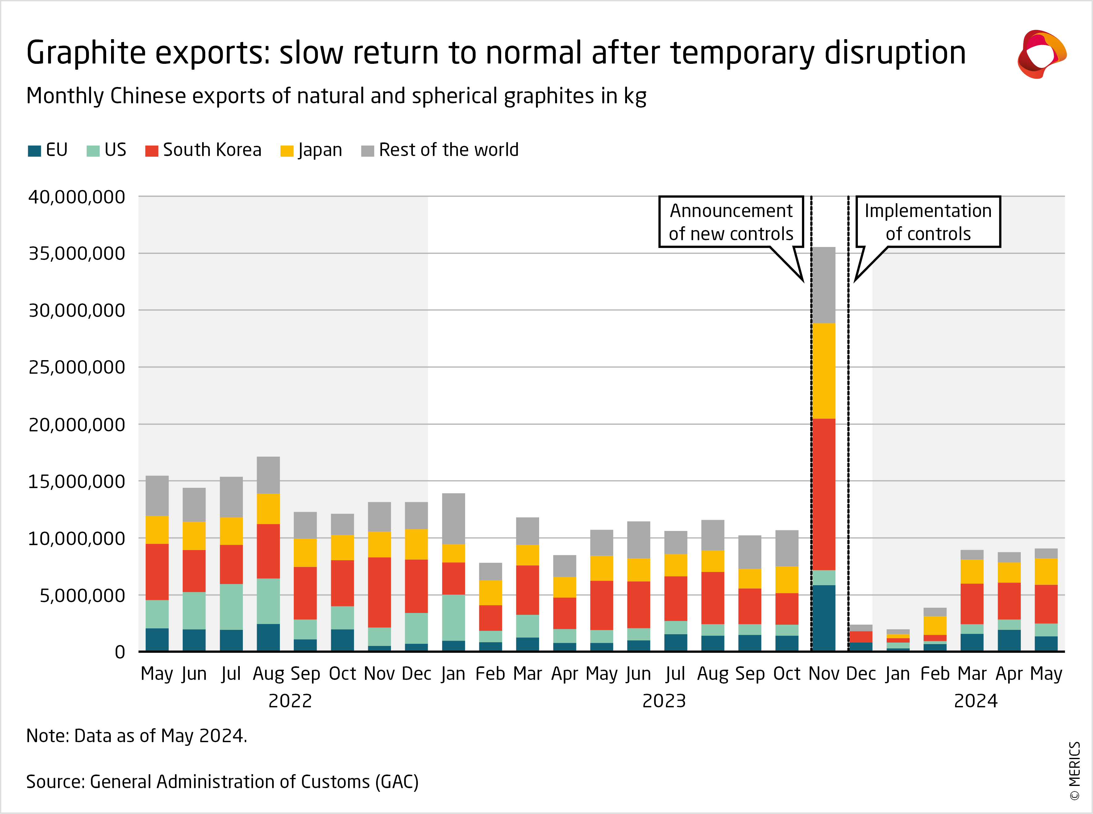 Against this backdrop, it is hardly surprising that the announcement of the new measures in October 2023 led to massive orders by OECD countries, especially those that are striving to shift battery and EV value chains away from China. G7 countries and South Korea saw the biggest frontloading and subsequent drop in Chinese sales of both spherical and natural graphite. The United States and Japan even had an unprecedented month of zero imports in December, possibly indicating that the authorities were delaying licenses for imports to those countries.