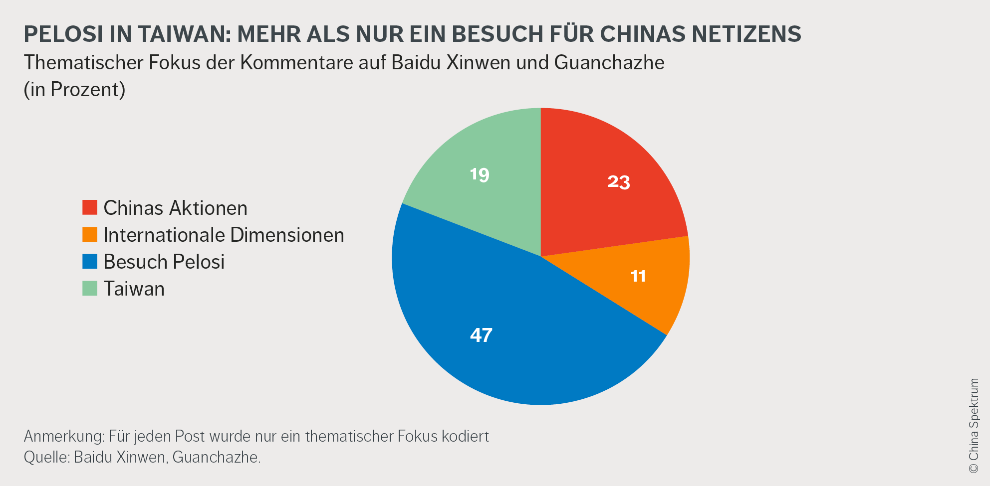 Auf den untersuchten Online-Plattformen Baidu Xinwen und Guanchazhe dominieren aggressive, nationalistische Töne in Bezug auf die Taiwan-Frage. Wenige chinesische Netzbürger:innen äußern Sorge vor einer militärischen Eskalation. Das zeigen die wenigen, aber allesamt kritischen Kommentare über die scharfen Posts des ehemaligen „Global Times“-Chefredakteurs Hu Xijin sowie vereinzelte Warnungen vor den Auswirkungen, die ein Krieg zwischen China und den USA hätte.