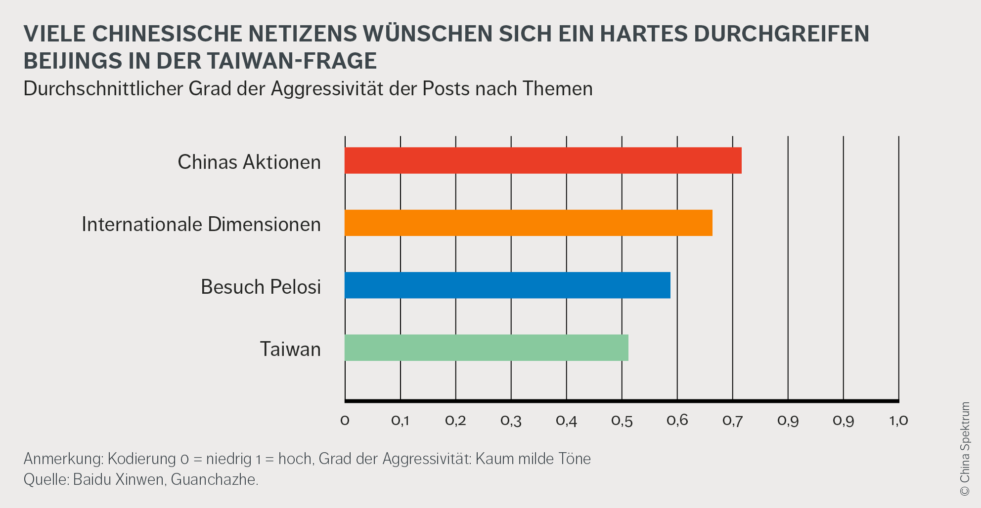 Nationalistische Töne rund um die Taiwan-Reise der Sprecherin des US-Repräsentantenhauses, Nancy Pelosi, überschwemmten Chinas soziale Medien Ende Juli und Anfang August. Im Fokusthema dieses China Spektrum Readers haben wir den Grad der Aggressivität und die Unterthemen von rund 4000 Kommentaren auf Baidu Xinwen und Guanchazhe analysiert. Unser Fazit: Viele Nutzer:innen fordern mehr Härte von ihrer Regierung – kein leichter Balanceakt für Partei- und Staatschef Xi Jinping, der sich auf dem Parteitag der KPC im Oktober für eine dritte Amtszeit bestätigen lassen möchte.