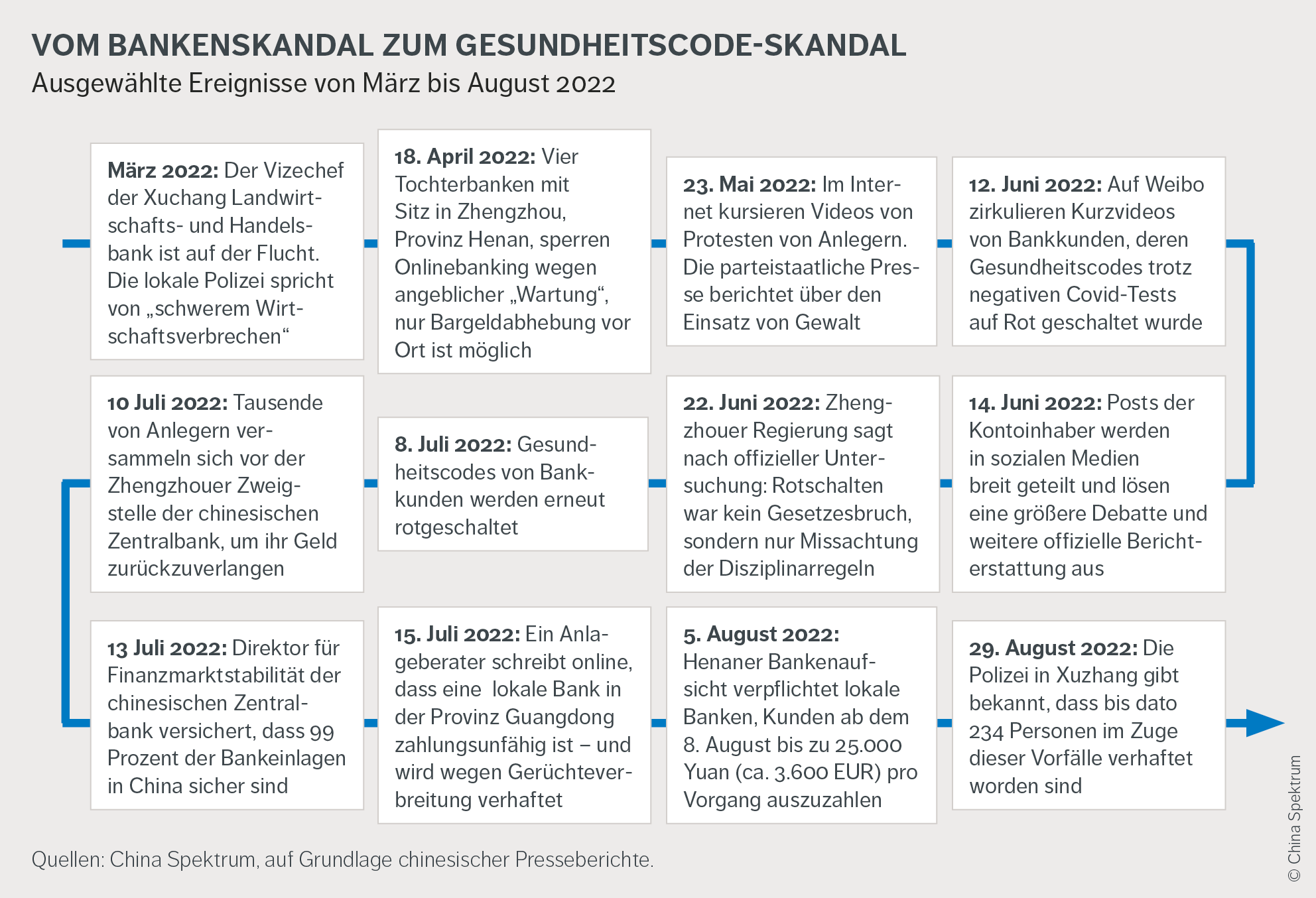 Mitte Juni schaltete überraschend bei mehr als 1.300 Menschen der Gesundheitscode auf ihren Smartphones auf Rot: Sie alle waren Kunden von vier Banken der zentralchinesischen Provinz Henan. Die Finanzhäuser waren in finanzielle Engpässe geraten und hatten ihren Anleger:innen bereits seit April den Zugriff auf Online-Konten verwehrt und Abhebungen vor Ort immer weiter eingeschränkt. Dann passierte Folgendes: