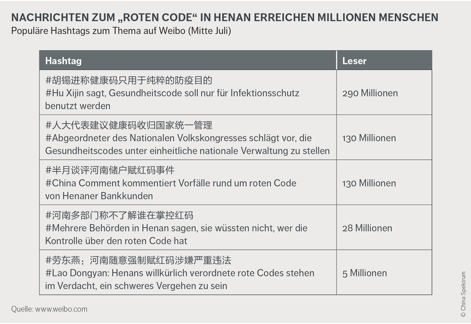 - Die zur parteistaatlichen Nachrichtenagentur Xinhua gehörende Zeitschrift China Comment (半月谈) forderte auf Weibo, die Behörden von Henan müssten erklären, wer die Entscheidung getroffen habe und wie es zur Änderung der Codes kommen konnte.