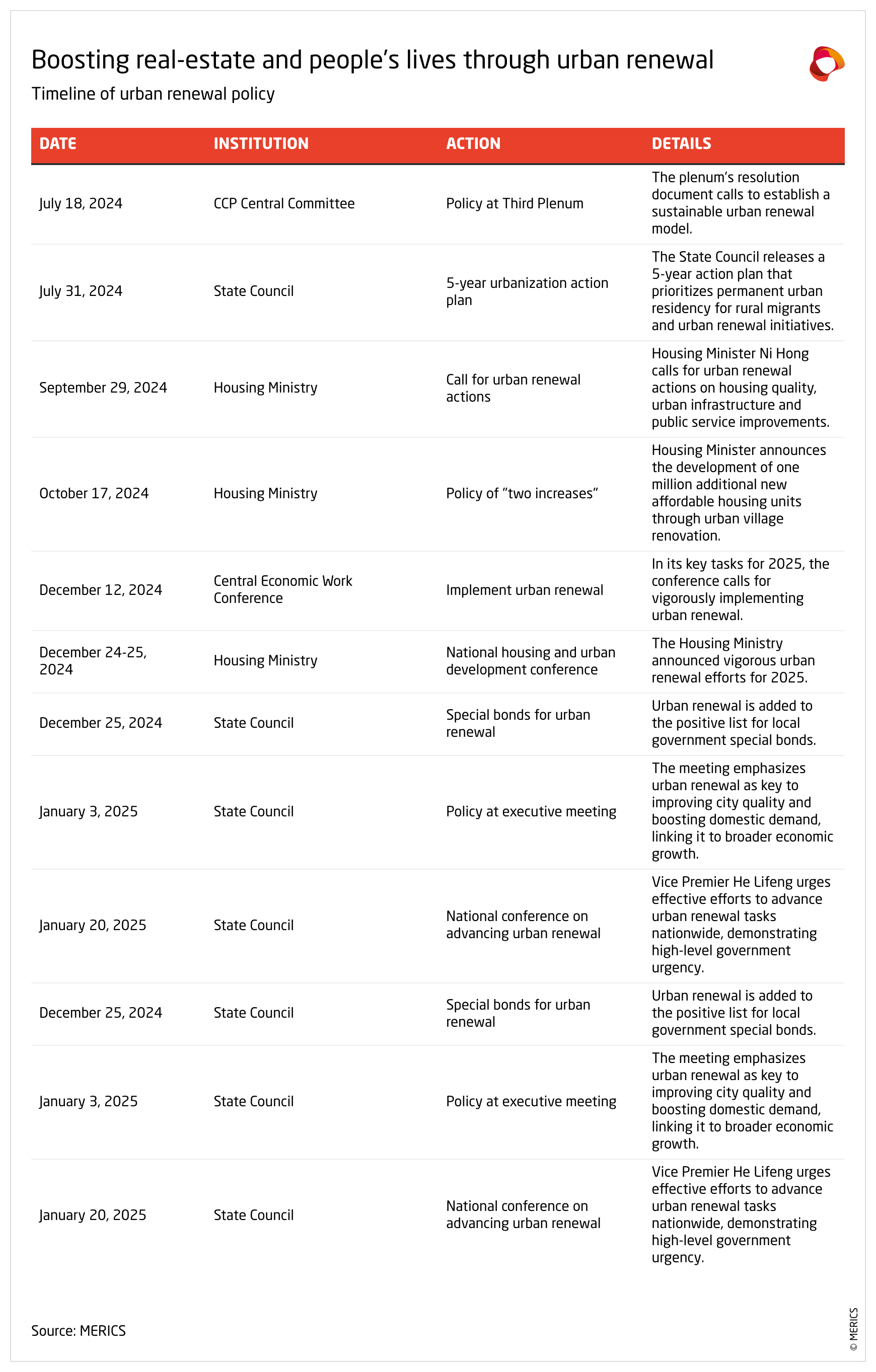 This drumbeat continued through the Central Economic Work Conference in December, where leaders embedded “implementing urban renewal actions” into the country’s top economic priorities for 2025. The State Council also released a key opinion on December 25 that officially added urban renewal projects to the positive list for local government special bonds. This expanded the scope of permissible bond-financed projects, enabling local governments to better fund housing redevelopment, infrastructure upgrades, and community improvements – an apparent response by the Ministry of Finance to a call from the Ministry of Housing and Urban-Rural Development.