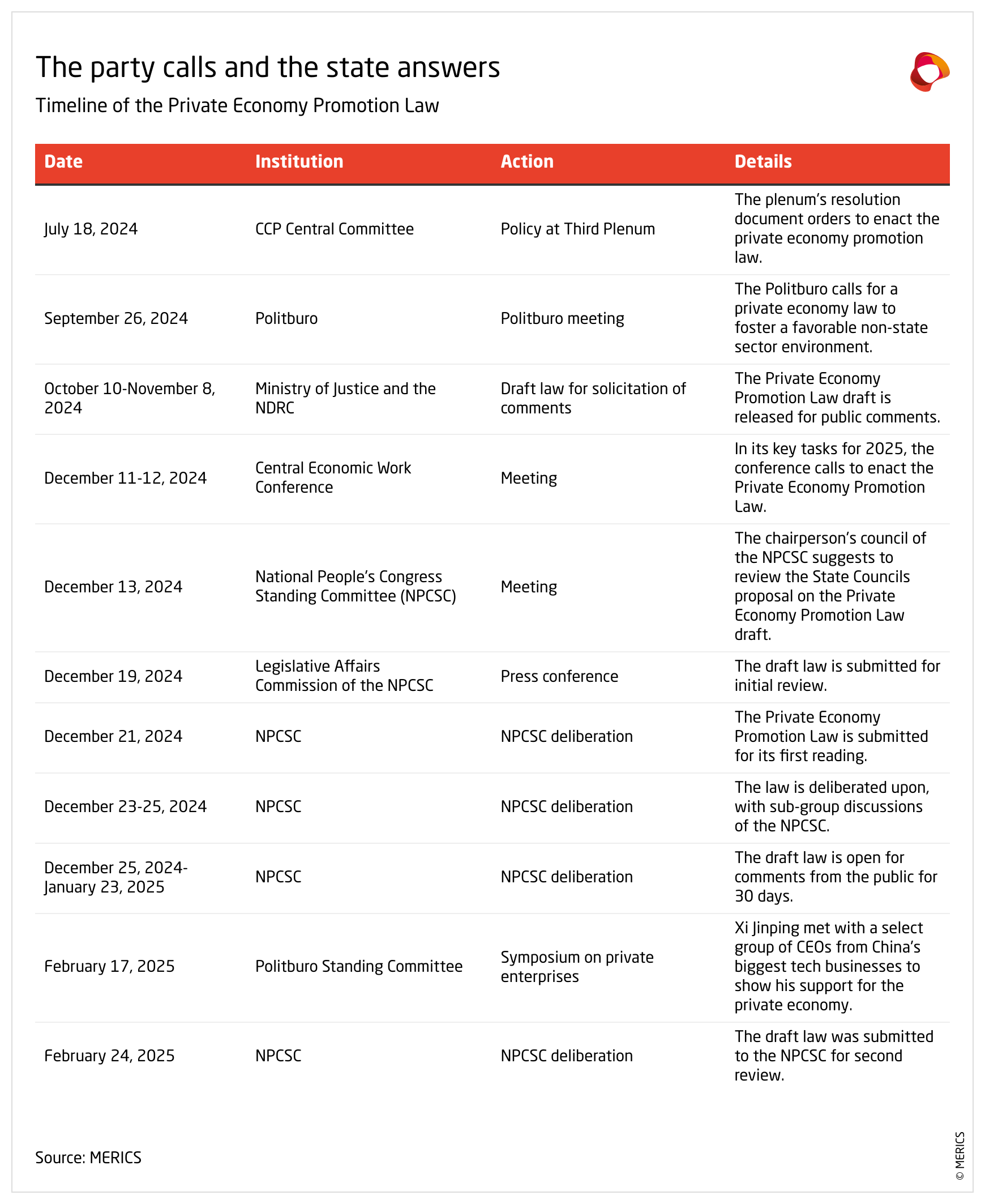 Since the Third Plenum made private economy promotion a top legislative priority in July, the Chinese government has repeatedly signaled its support for the private sector. In September, the Politburo emphasized that promoting the private economy would alleviate broader economic problems, thus framing the law not merely as a pro-business initiative but also as an essential policy tool for stimulating growth. This early messaging sent a clear signal that the party wanted swift action, positioning private-sector legislation as central to economic recovery.