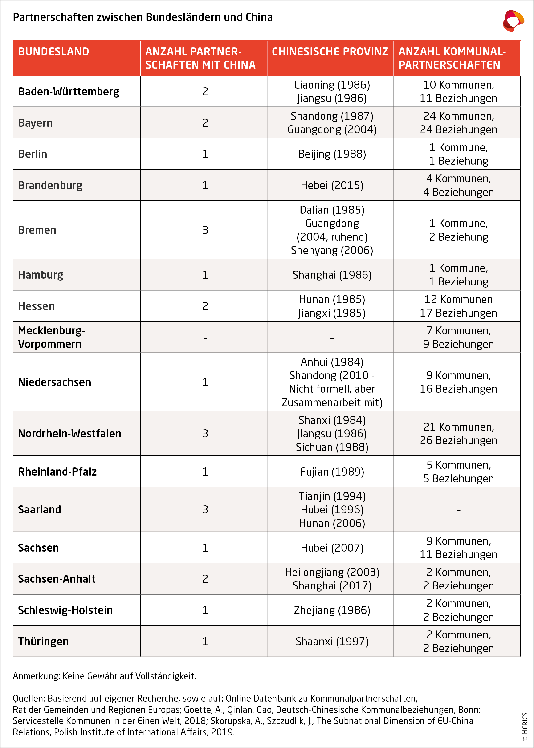 Die Beziehungen zwischen China und Deutschland sind vielfältig und haben über die Jahre auf subnationaler Ebene rasant zugenommen. Alle Bundesländer, mit Ausnahme Mecklenburg-Vorpommerns, unterhalten inzwischen eine Partnerschaft mit einer chinesischen Provinz. Es gibt zahlreiche Städtepartnerschaften, und rund 115 deutsche Kommunen pflegen Beziehungen zu China (siehe Annex 1).1 Darüber hinaus bestehen verschiedene deutsch-chinesische Gesellschaften und Freundschaftsgruppen, enge Wirtschaftsbeziehungen und mehr als 1400 deutsch-chinesische Hochschulkooperationen.2