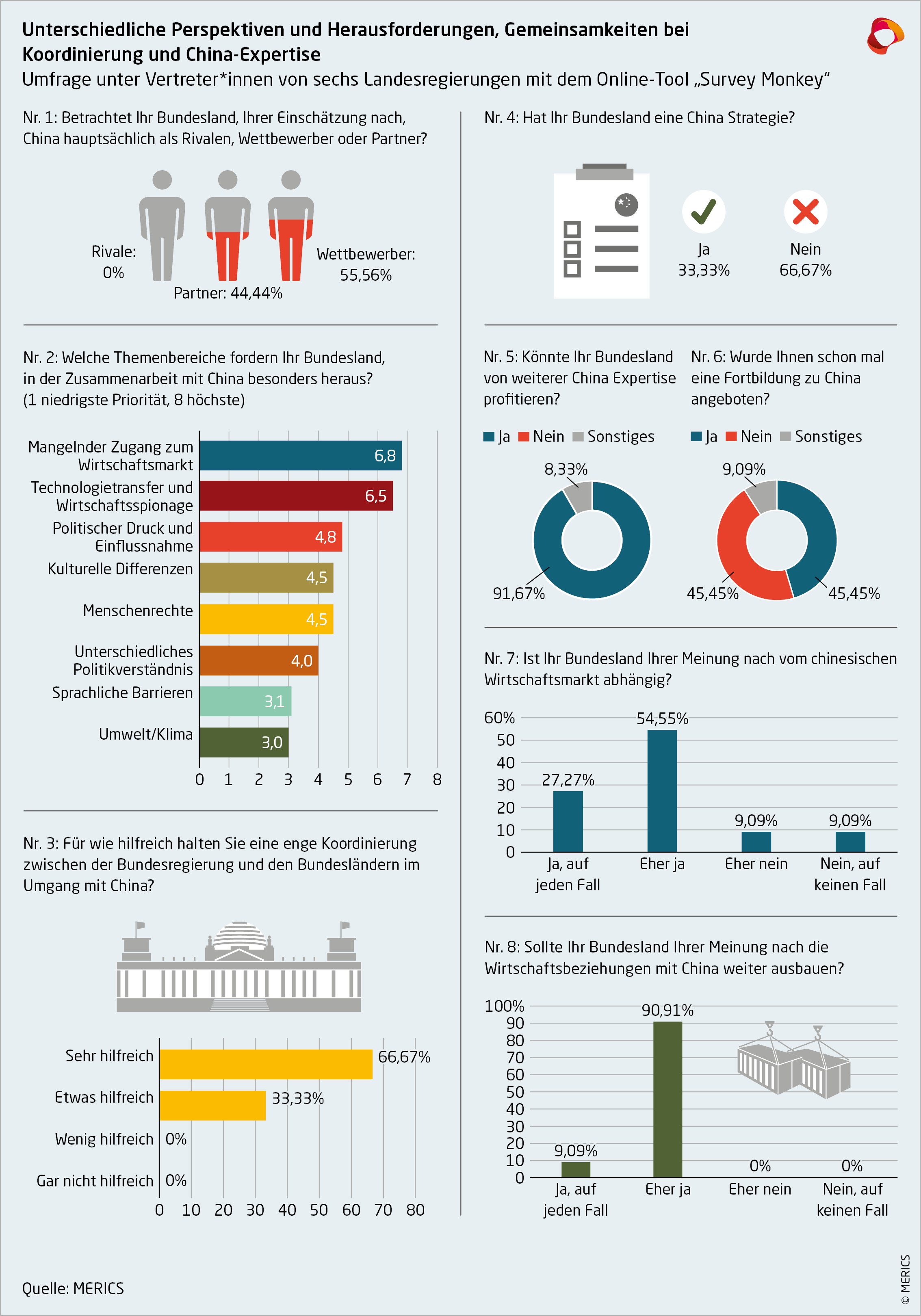 Intensivere Wirtschaftsbeziehungen bieten viele Vorteile, wie Zugänge zum chinesischen Markt und die Entstehung neuer Arbeitsplätze. Es besteht allerdings auch das Risiko, tatsächliche und imaginierte wirtschaftliche Abhängigkeiten zu China zu schaffen. Eine deutliche Mehrheit der befragten Vertreter*innen aus sechs Landesregierungen vertrat die Meinung, dass ihr Bundesland vom chinesischen Markt abhängig ist (siehe Abbildung 2, Umfrage Nr. 7). Gleichzeitig befanden alle, ihr Bundesland solle die Wirtschaftsbeziehungen zu China weiter ausbauen (siehe Abbildung 2, Umfrage Nr. 8).