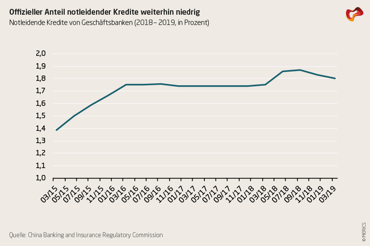 Die NPL-Quote der Baoshang Bank soll 2016 bei nur 1,68 Prozent gelegen haben. Das wäre gemessen an EU-Standards sehr gering, wo die durchschnittliche NPL-Ratio bei 3,8 Prozent liegt. Die Sorge vieler Beobachter ist, dass die ebenfalls sehr geringe Gesamt-NPL-Ratio für China, die Ende März bei 1,8 Prozent lag (siehe Abbildung), nicht dem tatsächlichen Anteil notleitender Kredite entspricht.