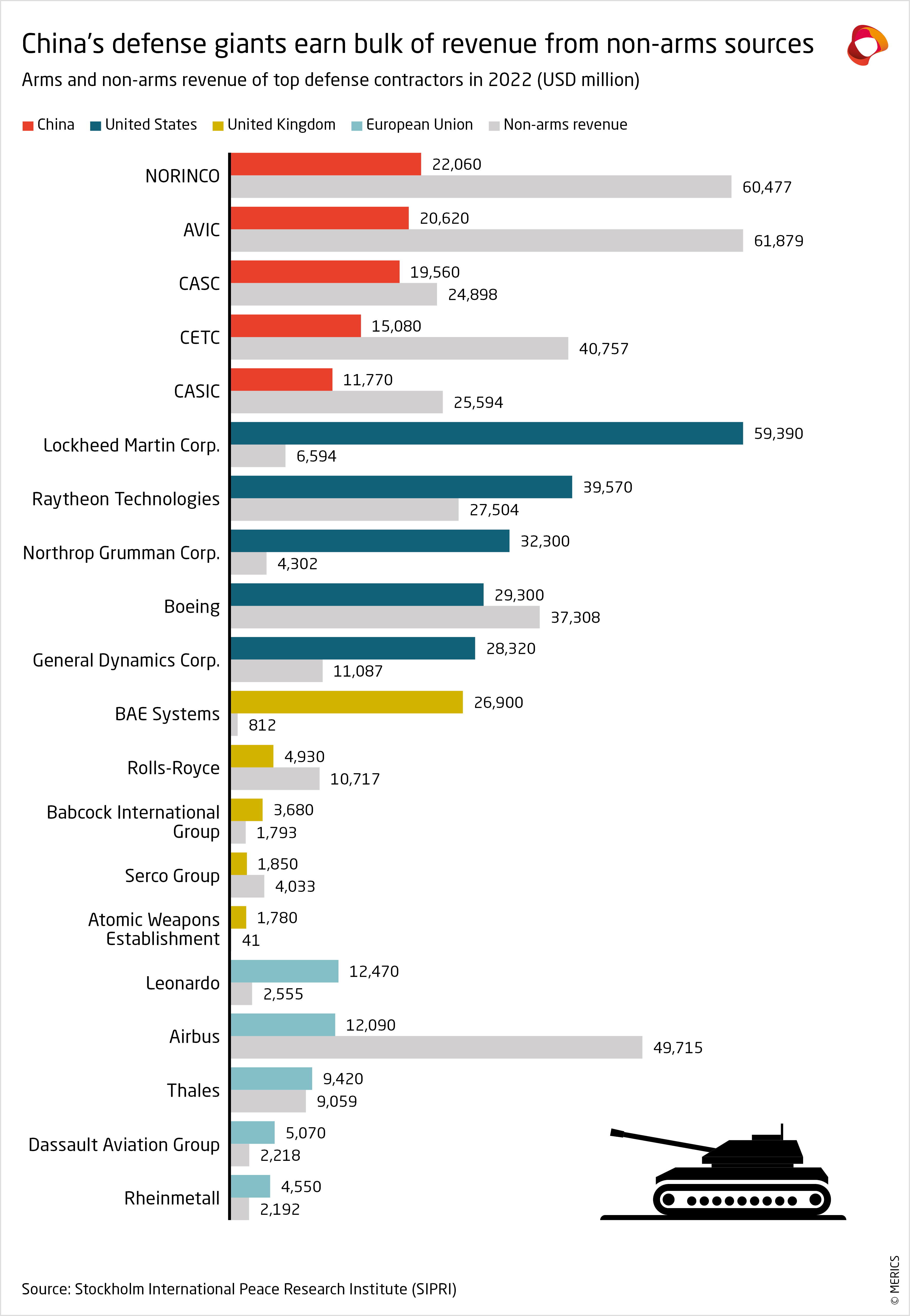 Like Norinco, other major Chinese arms manufacturers get only a minor share of their revenue from arms sales. Among China’s top five arms makers, the highest share of revenue derived from arms sales is around 44 percent at China Aerospace Science and Technology Corporation. At the others, it ranges between 25 percent to 32 percent. By contrast, among the top five US players, the lowest share of revenue derived from arms sales is around 44 percent at Boeing, with the highest share being 90 percent at Lockheed-Martin. European arms makers, likewise, are predominantly dedicated to arms production and adjacent civilian applications.