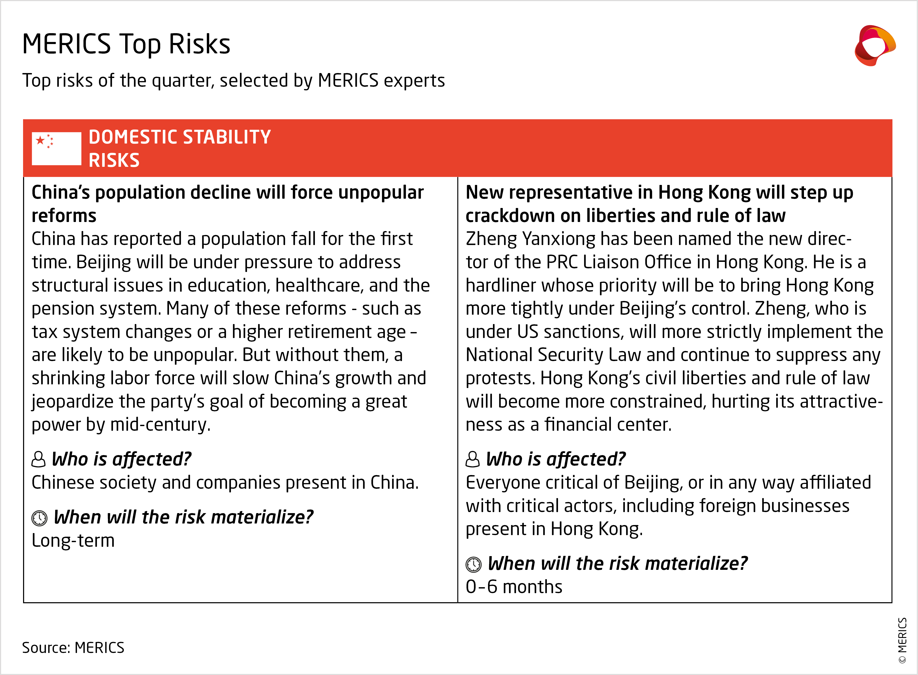 - Strengthening China’s messaging and foreign affairs legislation: Beijing will continue to strengthen its international communication capacity to “tell China’s story well”. New legislation strengthening Beijing’s extraterritorial reach and its ability to retaliate against Western sanctions, or unilaterally impose its own, can also be expected.