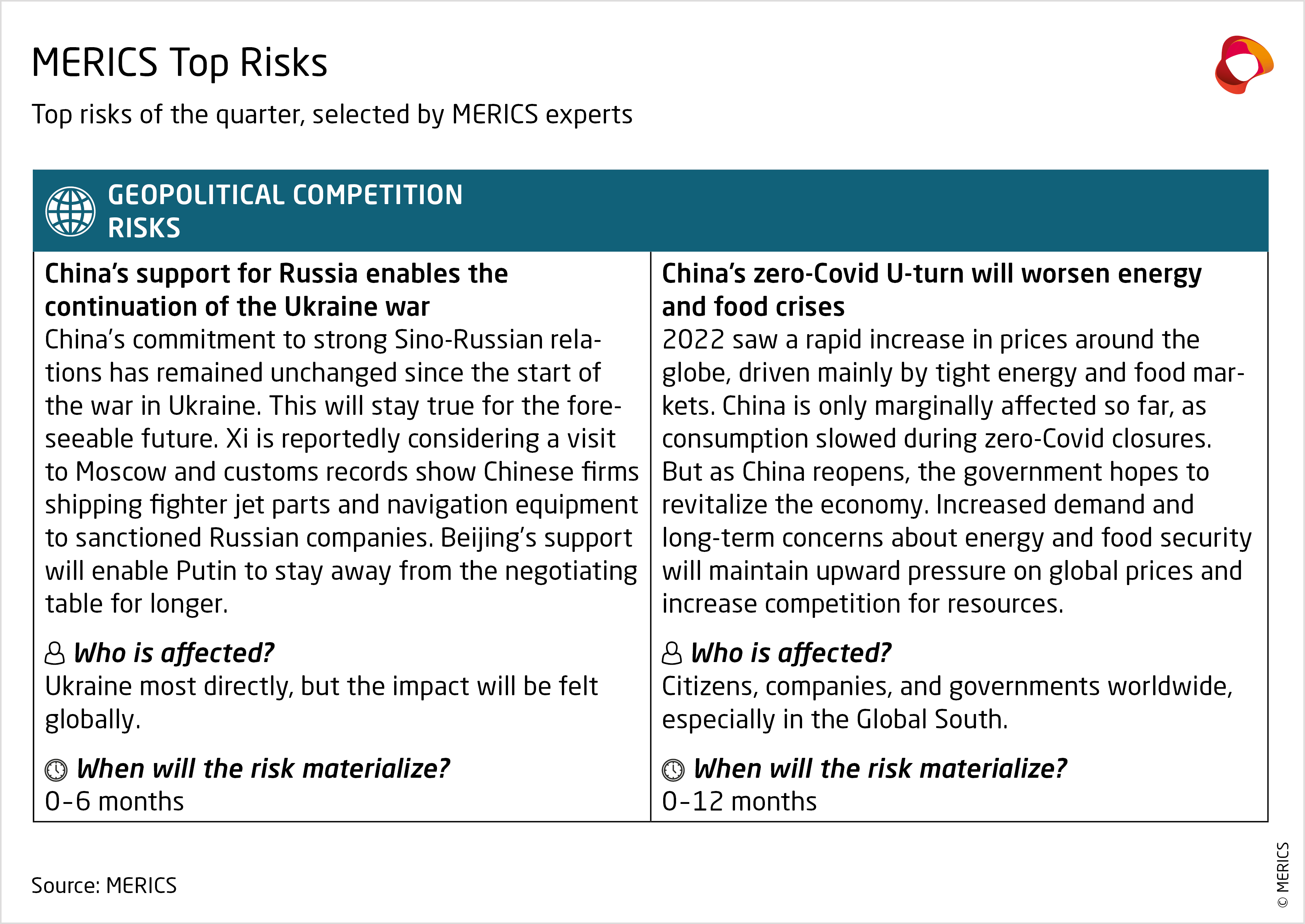 These economic developments will increase the socio-economic pressure on the government in 2023. They corrode the unspoken social contract between the party-state and the people that promises increasing prosperity in exchange for political passivity. While a widespread movement against the current leadership is highly unlikely, the CCP will have to rack up some major successes to shore up the confidence of Chinese citizens. This will be tricky in an increasingly uncertain external environment. The additional pressures on the party-state and on society at large could lead to miscalculation. Internationally, a weak Chinese recovery would likely drag down global growth at an already economically bearish time, and might even contribute to a major downturn.