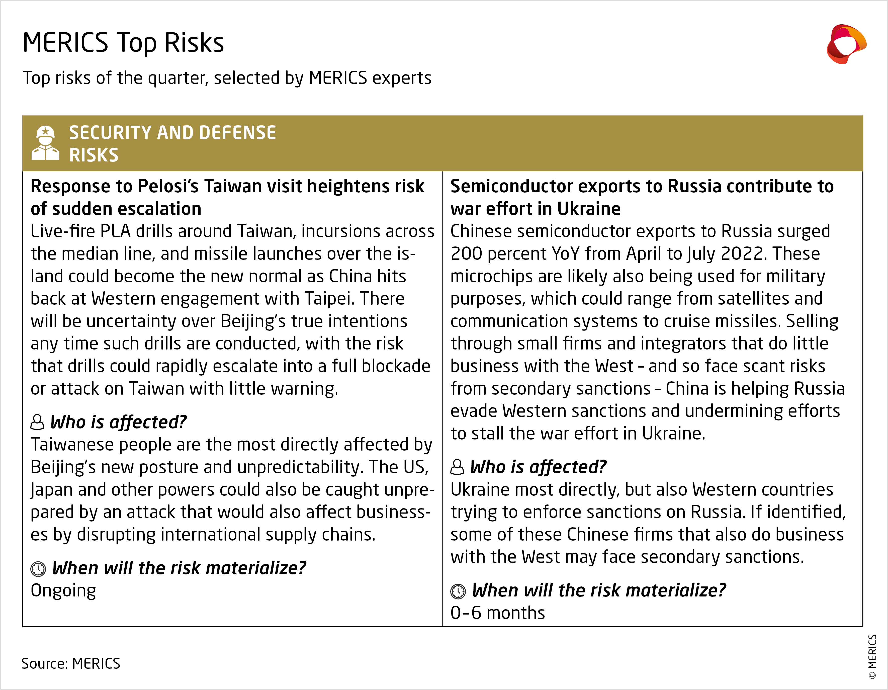 Beijing imposed new restrictions on cross-Strait trade in response to Speaker Pelosi’s visit to Taiwan with a US congressional delegation. China has blocked the import of over 2,000 of Taiwan’s 3,200 categories of agricultural exports, though this amounts to only a tiny fraction of the USD 328 billion in bilateral trade in 2021. Beijing also blocked further exports of sand to Taiwan (Taiwan sources around 90 percent of its sand imports from China), which will be a temporary, though small, drag on the construction sector until new suppliers are found. Finally, the live fire military exercises had a minor impact on cargo ships navigating the strait; some chose to pass Taiwan’s eastern coast instead, while others struggled to access certain ports safely.