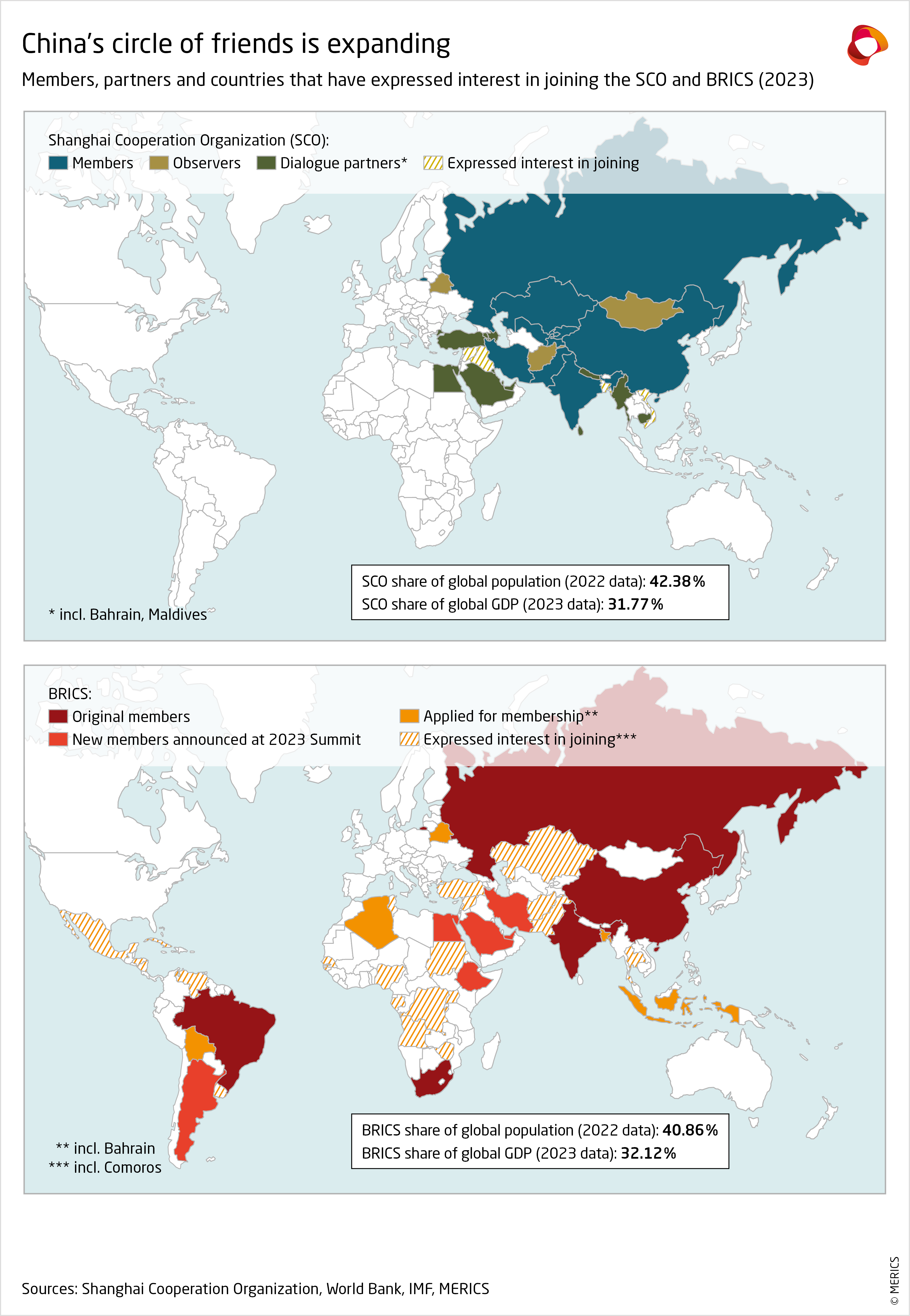 To build a counterweight to international institutions seen as too Western-dominated, Beijing wants to expand the BRICS grouping and the Shanghai Cooperation Organization (SCO). Chinese officials expressed strong support for adding new members to both organizations in the months leading up to two summer summits – the July SCO summit hosted by India (whose full members are four ex-Soviet border states plus India, Pakistan, Russia, China and now Iran)1 and the August BRICS summit of Brazil, Russia, India, China and South Africa in Johannesburg.2 Beijing’s efforts within BRICS were successful. At the summit in South Africa, the group announced six new members that will join starting January 1, 2024: Argentina, Egypt, Ethiopia, Iran, Saudi Arabia and the UAE.