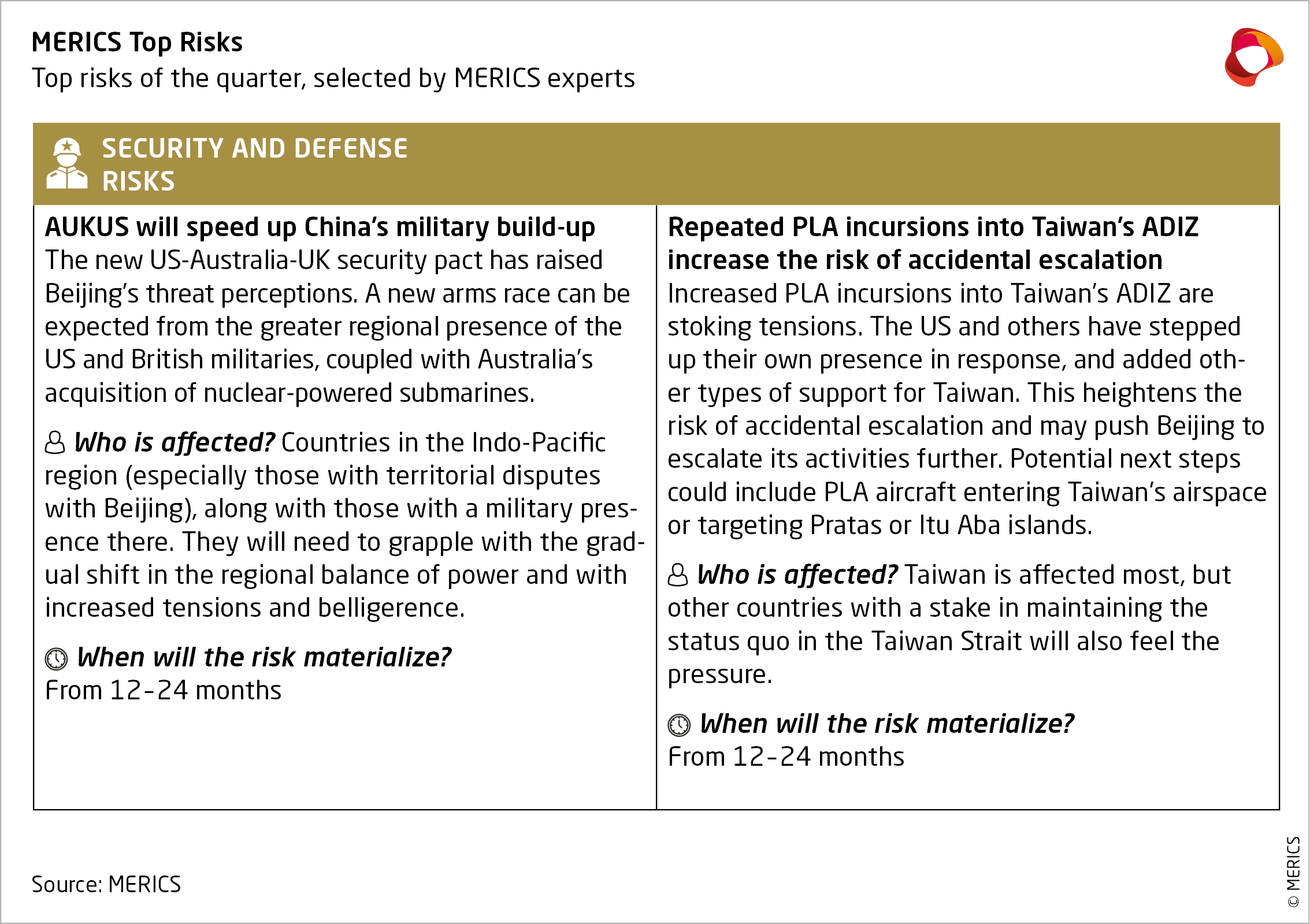 Regional tensions are likely to be increased by the AUKUS trilateral security pact that Australia, the US and the UK, announced in September to provide Australia with US nuclear-powered submarine technology. The AUKUS coalition will raise Beijing’s threat perceptions, prompting it to double down on military build-up and modernization. We can expect Beijing to invest further in expanding its nuclear arsenal and anti-submarine warfare capabilities.