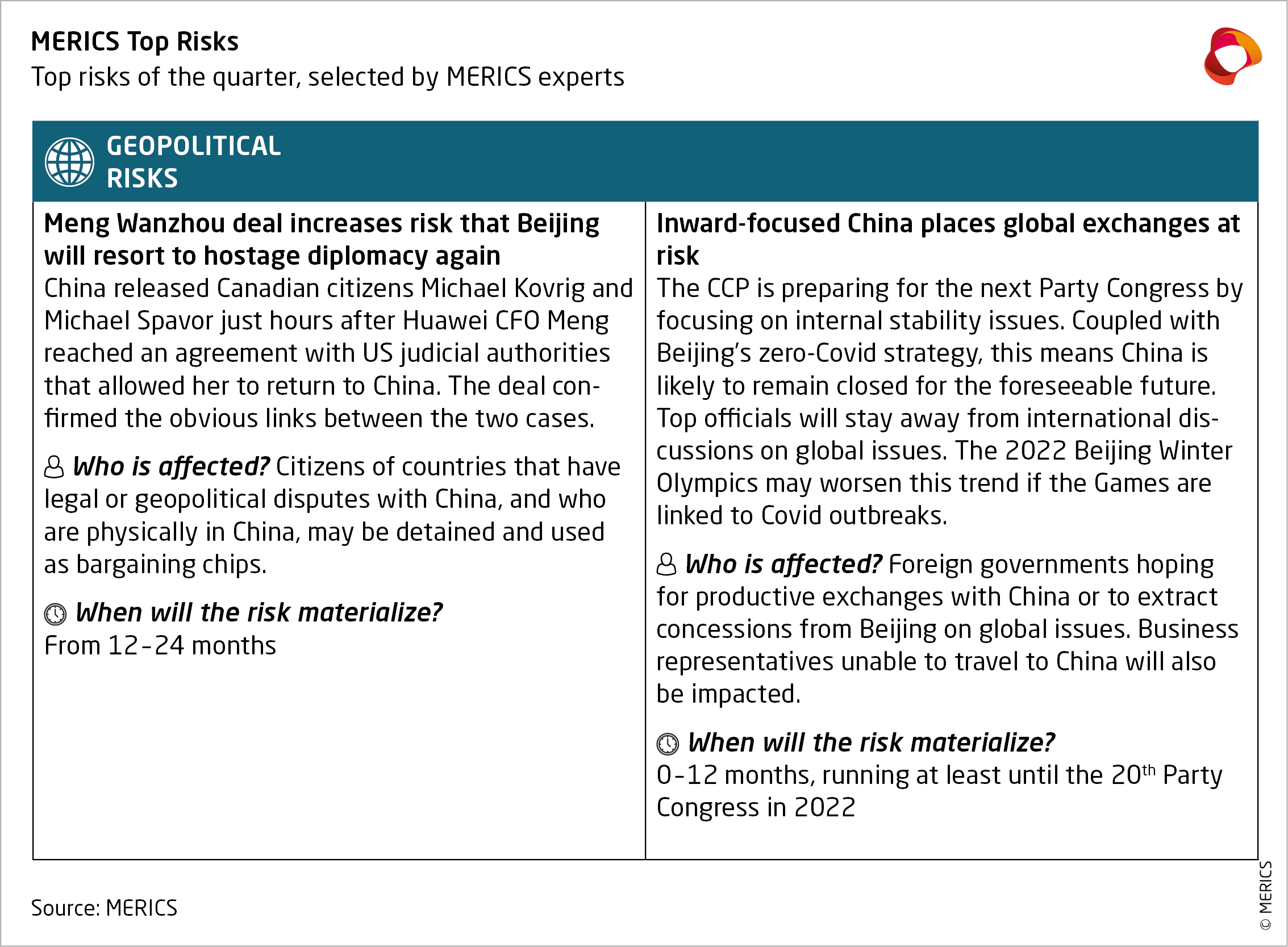 US prosecutors also reached a deal with Huawei CFO Meng Wanzhou that allowed her to return to China instead of being extradited to the US. Beijing responded by releasing Canadians Michael Kovrig and Michael Spavor after almost three years in detention. While it is premature to speak of a thaw in US-China ties, these moves were an attempt to reopen the lines of communication between Washington and Beijing. Better communication channels can help to manage competition and to prevent accidental escalation of current tensions, particularly over Taiwan. Meanwhile, Beijing sees an opportunity to bring ties with Europe back on track after a few tense months. China seems sure to look for benefits from the transitional period following Germany’s September elections and France’s dissatisfaction at the AUKUS announcement.