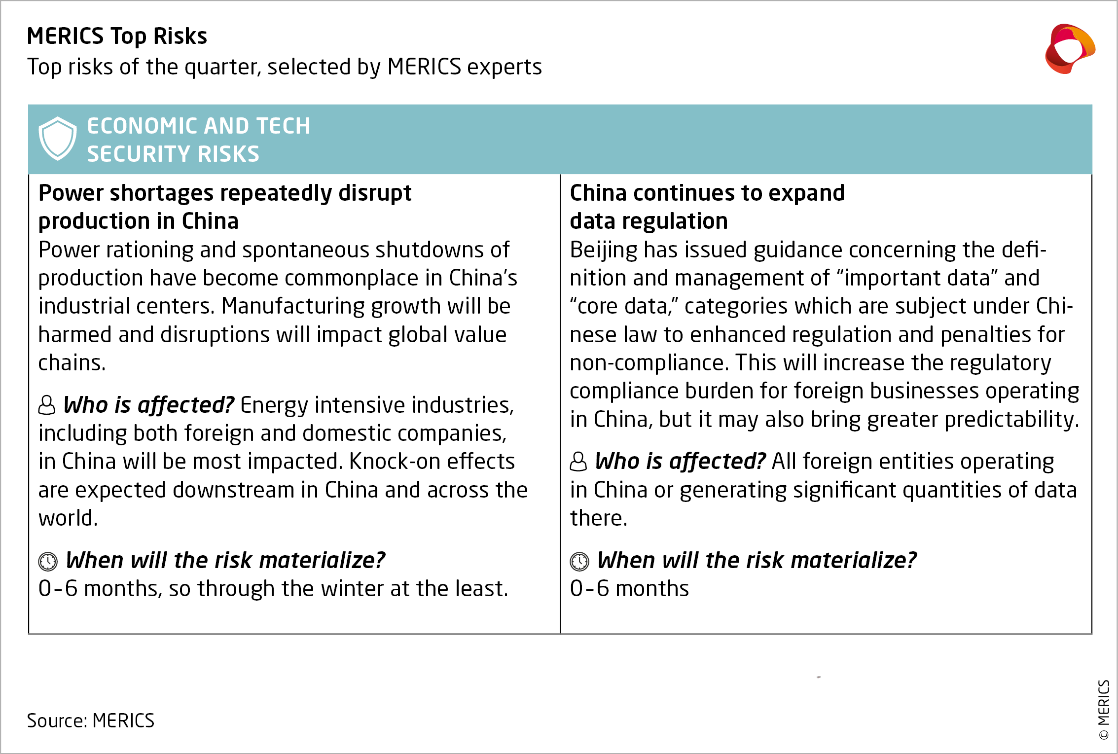 China continues to ratchet up pressure on Taiwan. Beginning on China’s October 1 National Day, Beijing sent over 150 planes into Taiwan’s air-defense identification zone (ADIZ) over five consecutive days. Chiu Kuo-cheng, Taiwan’s Minister of Defense, noted on October 6 that Beijing would be militarily capable of taking the island by 2025, prompting close attention to President Xi’s speech on October 9 commemorating the anniversary of the 1911 Xinhai Revolution. The speech was carefully parsed for any references to an official shift in China’s policy towards Taiwan. However, Beijing’s official position remains unchanged. President Xi said that he wants reunification to happen, but there is no sign that he is ready to resort to military force and provoke a conflict with the US. Open conflict is highly unlikely in 2022, as instability must be avoided ahead of the 20th Party Congress. During 2022, Beijing is likely to continue pressure on Taiwan through grey zone tactics, while staying below the threshold of conflict. However, the risk that Beijing may decide to provoke a conflict in the medium-term continues to increase.