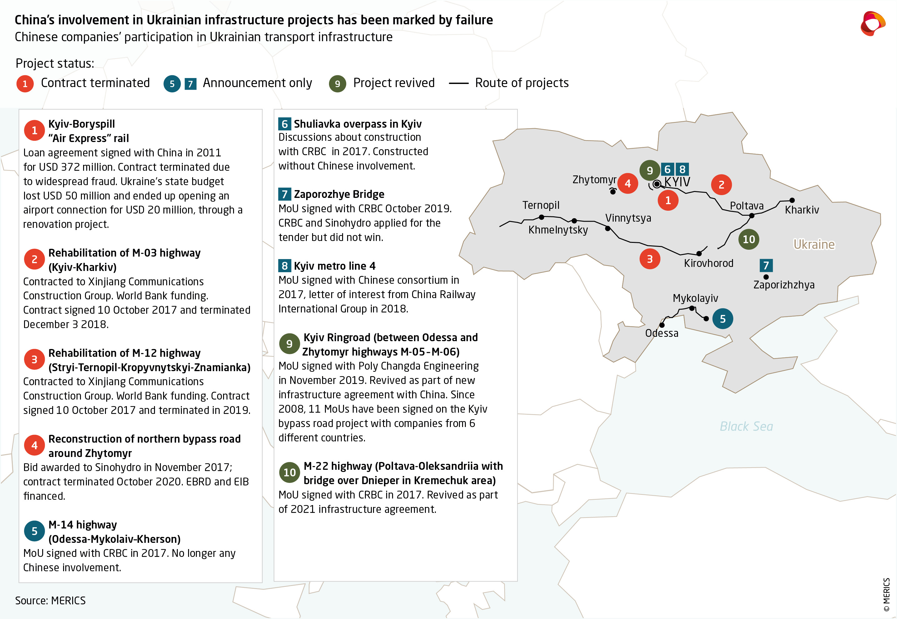 China does not have a good record on building transport infrastructure in Ukraine. Billions of dollars’ worth of strategic projects have been announced, but none of them have come to fruition. Cooperation in infrastructure has been stymied by Ukrainian requirements for open bidding processes. Several Chinese contractors have managed to win tenders, only to see contracts terminated due to slow progress. Cooperation with Chinese companies has been more successful in port dredging contracts, renewable energy projects, and agriculture.