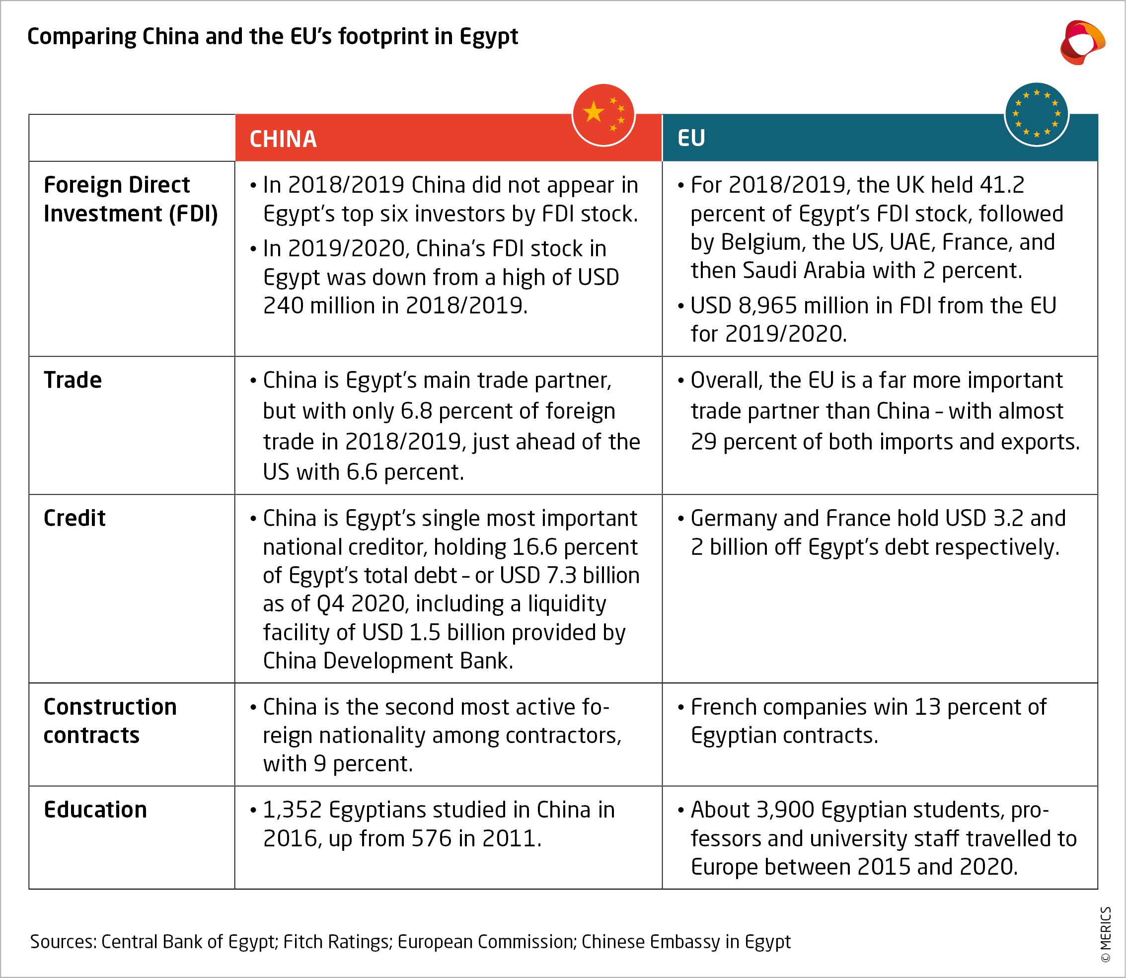 Egypt is Africa’s second largest economy (USD 394 billion)10 and its third most populous country (100 million in 2019).11 It is an interregional gateway, looking north to the Mediterranean, east to the Gulf, and south to wider Africa. The Suez Canal makes Egypt globally relevant, and its growing young population imbues it with further market potential. In short, Egypt is an important country, not just for China, but for every global actor, including the EU.