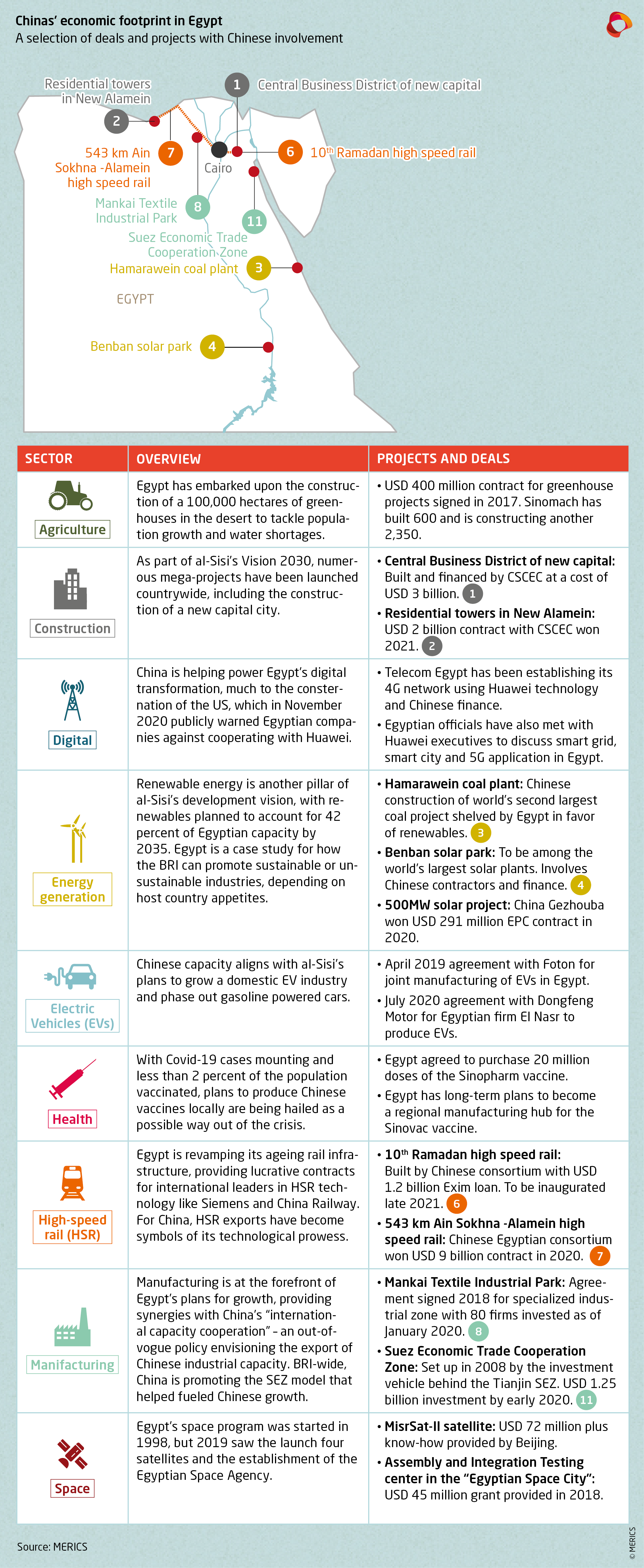 The striking optics of Chinese skyscrapers rising in the Egyptian desert have captured recent headlines,9 but China’s footprint in Egypt extends well beyond its involvement in the country’s new capital city project.