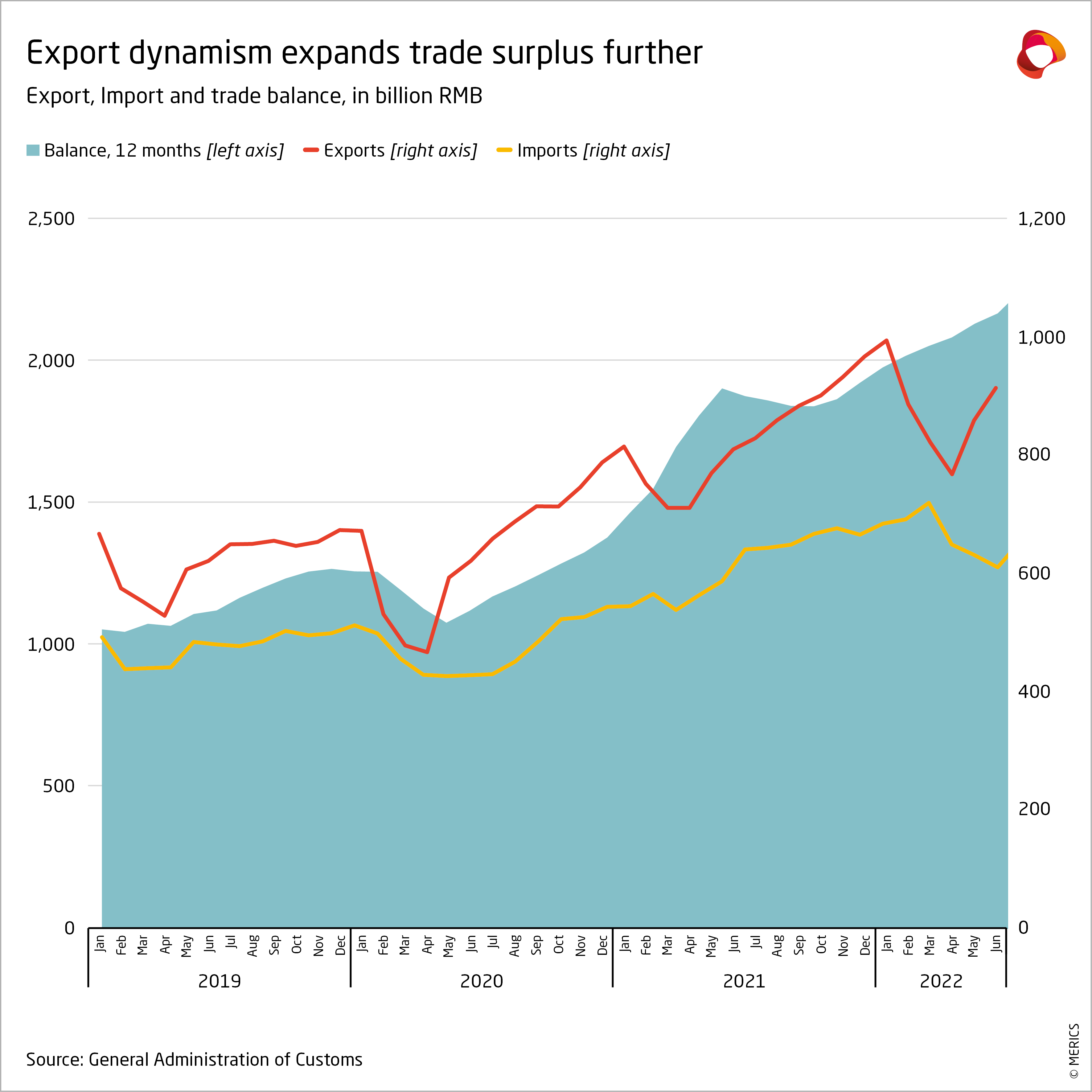 - The widening gap between import and export growth has pushed China’s trade balance to new records (see exhibit 1). China’s trade surplus at the end of the first half of the year was almost 60 percent up on H1 2021.