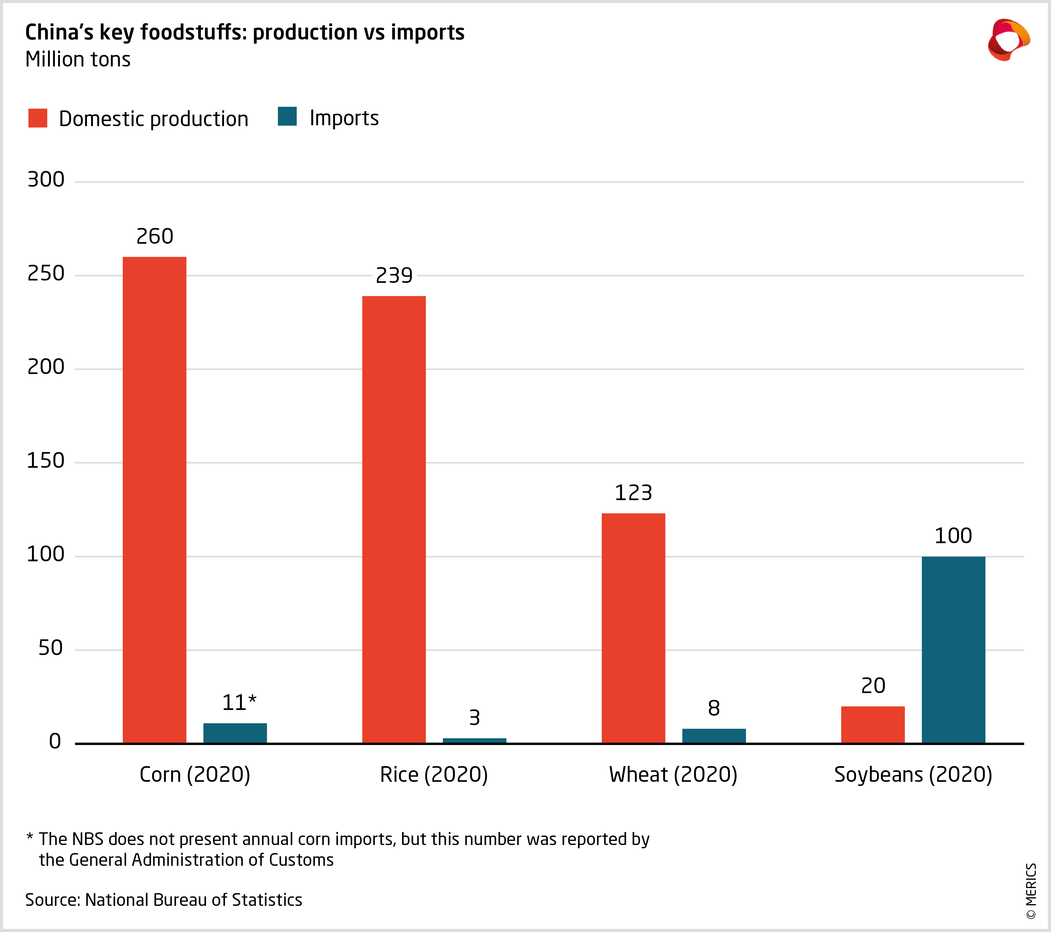 China has a long-standing target of 95 percent self-sufficiency in key grain production, and needs few imports for food security. Supply is achieved through a mix of protectionism and stabilizing factors. Imports are highly restricted through a tariff rate quota system, which allows importation of just enough grain to reach domestic consumption levels at duties as low as 1 percent. Once quotas are reached, tariffs rise up to 65 percent, making imports cost-prohibitive and thereby protecting domestic producers. Within this protected market, subsidies help regulate prices, as does COFCO through its dominant position in key foodstuff processing and distribution.