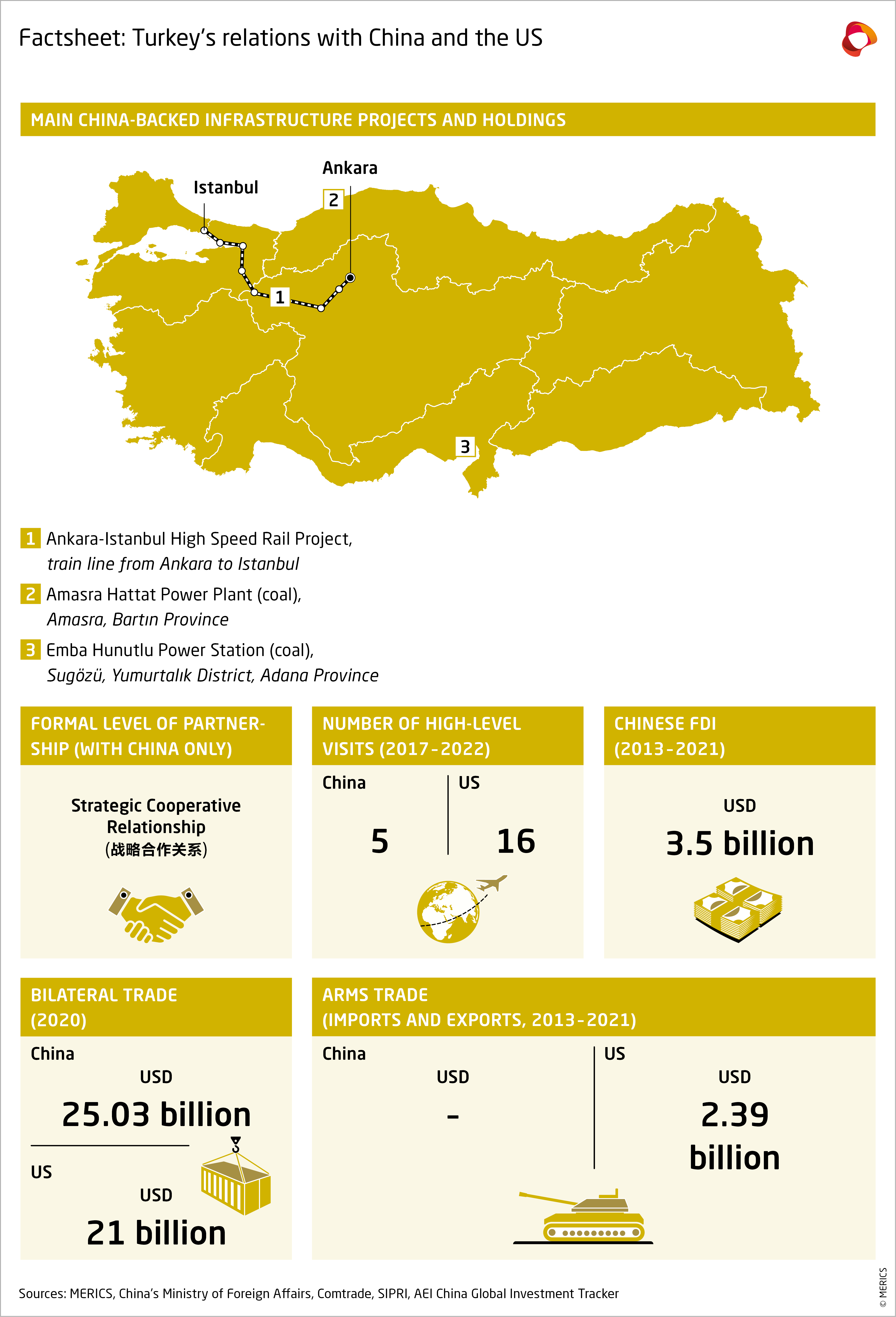 Sino-Turkish economic relations have improved greatly since 2001. Bilateral trade volumes were worth USD 32 billion in 2021, compared to USD 1 billion in 2001.11 However, Turkey has a trade deficit with China – imports are worth roughly nine times the value of Turkish exports. In 2019, capital goods worth around USD 7 billion made up the biggest share of total trade volume. Machines and electrical goods ranked second; they were worth approximately USD 6 billion.12 Compared with China and Russia, the EU was Turkey’s largest export and import partner in 2021. Approximately 33 percent of Turkey’s imports came from the EU, which took 41 percent of the country’s exports. By contrast, Turkish exports to China were only 2 percent of Turkey’s total export volume in 2021. However, China was Turkey’s largest import partner among individual countries. Russia was the second-largest import partner, taking goods worth approximately USD 29 billion; Germany was the third largest import partner with goods valued at roughly USD 22 billion in 2021.13