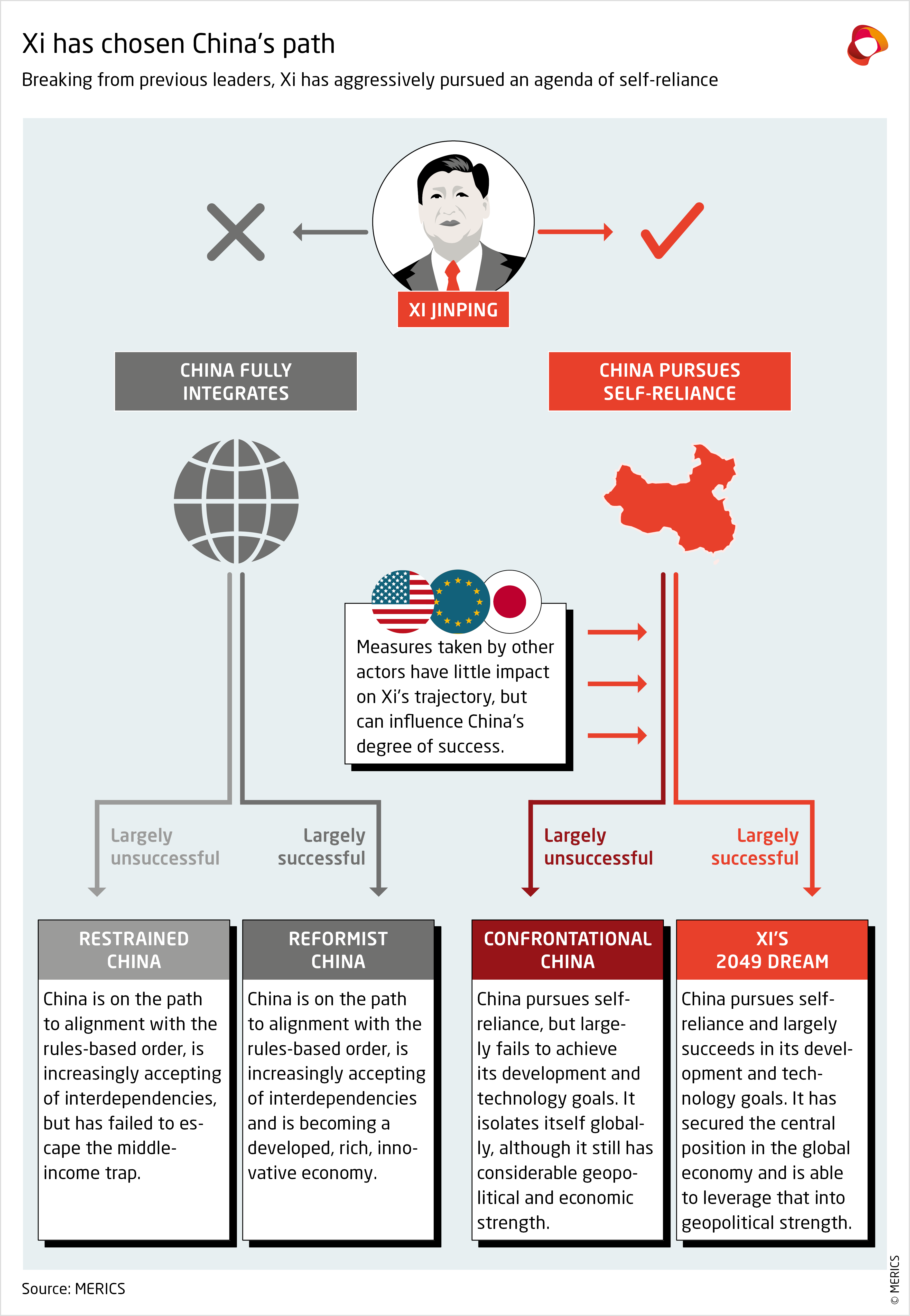 While countries may only exert limited pressure on China to deviate from Xi’s charted course, there are plenty of other ways to affect its chances for success. Somewhat oversimplified, countries with liberal market economies may continue to give China access to their markets and technologies, or they may further restrict it. China, on the other hand, may accept economic and technological interdependencies with liberal market economies, or further pursue self-reliance. The issue is that every step China takes toward self-reliance pushes liberal market economies to restrict China’s access to their markets and technology. In turn, this drives China further down the road of self-reliance.