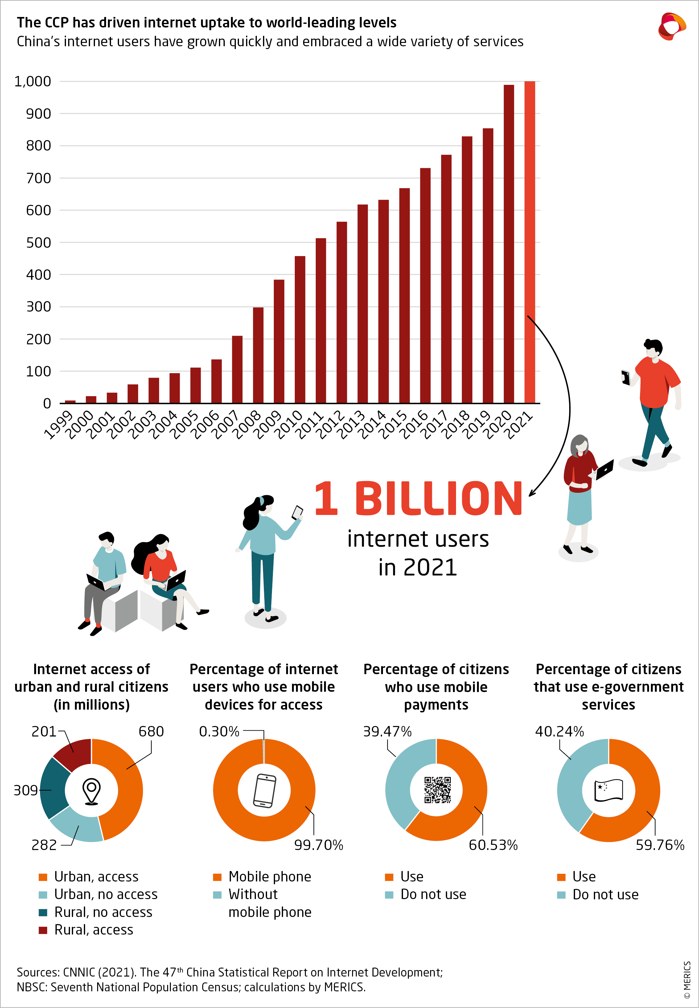 Leadership in key digital technologies and applications coupled with control over information transmitted through cyberspace, is seen as central to economic and systemic competitiveness. The Chinese government has rapidly driven forward the country’s network expansion. The number of Chinese internet users is set to cross the one billion mark in 2021, or a penetration rate of more than 70 percent. Chinese citizens now account for one fifth of global internet users.2 The leadership strives to stay at the forefront of new technological developments. China’s telecoms operators had installed around 819,000 5G telecoms base stations by May 2021.
