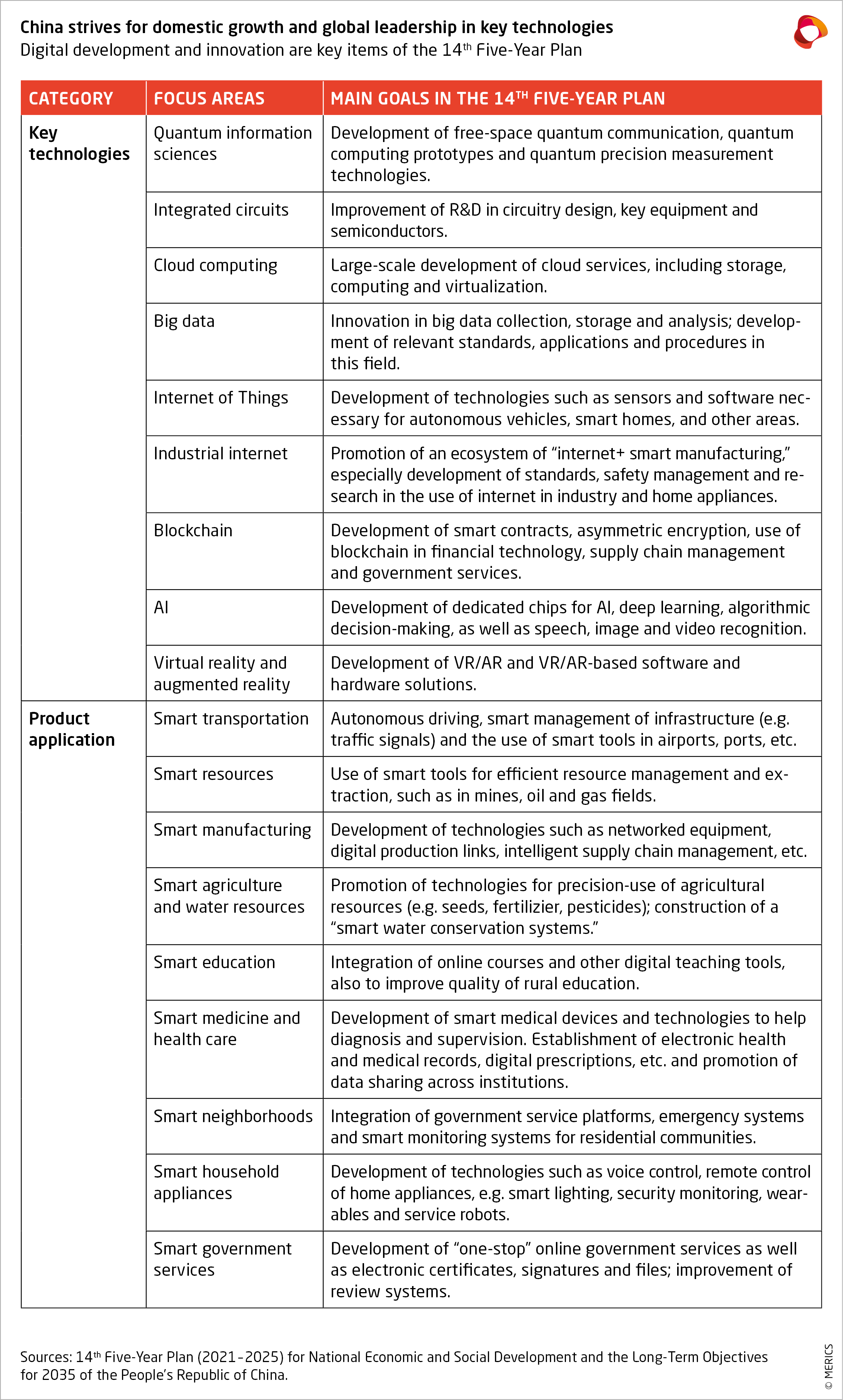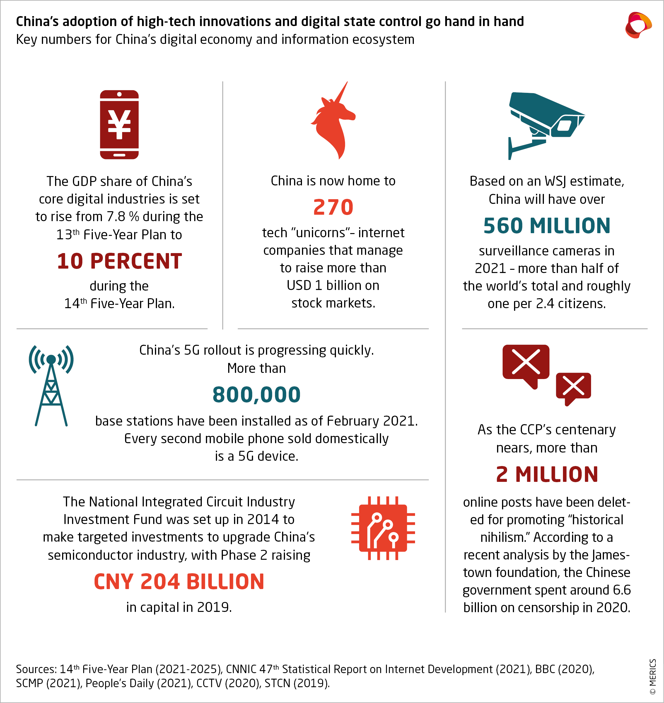 Digitalization and informatization remain key items on China’s political agenda, with the explicit goal of using big data to modernize national governance. The 14th Five Year Plan (2021-2025), adopted by the National People’s Congress (NPC) in March 2021, is supposed to usher in a new chapter of smart and modern Chinese Communist Party (CCP) rule.3 Building on the “Internet+”-strategy established in the previous five-year plan it focuses on leveraging information and communication technologies (ICT) to improve governance efficiency across sectors.
