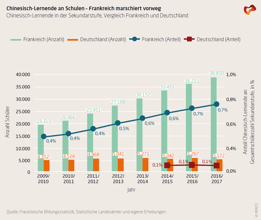 - Schulen sind der ideale Ausgangspunkt für den Ausbau von China-Kompetenz in der Breite und Spitze. Langjähriger, kompetenz- und standardorientierter, d.h. schulisch voll integrierter und etablierter Chinesisch-Unterricht schafft wichtige Voraussetzungen für mehr China-Kompetenz.